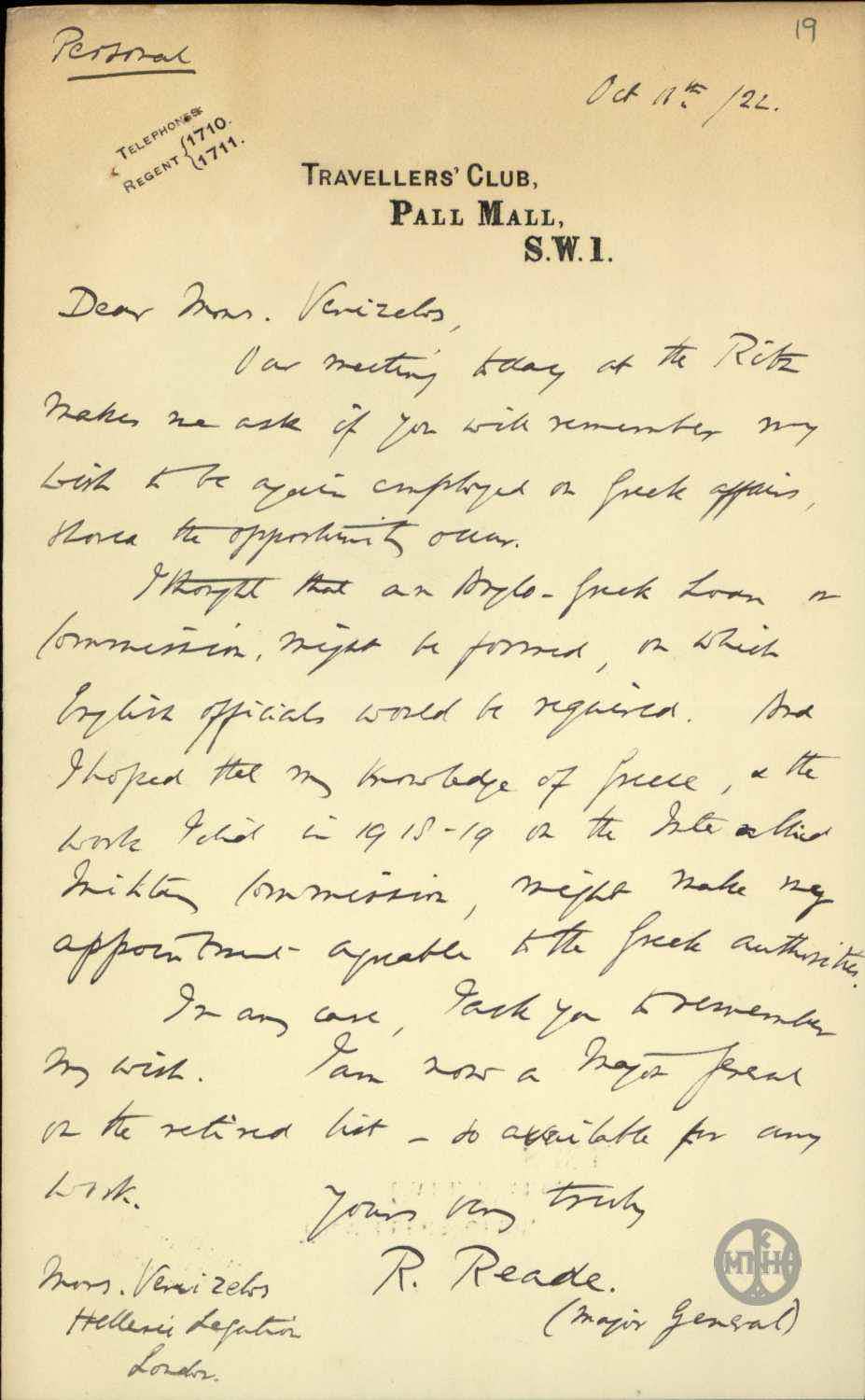 | ΤΙΤΛΟΣ | Επιστολή του R.Reade προς τον Ε.Βενιζέλο σχετικά με αγγλο-ελληνικό δάνειο. |