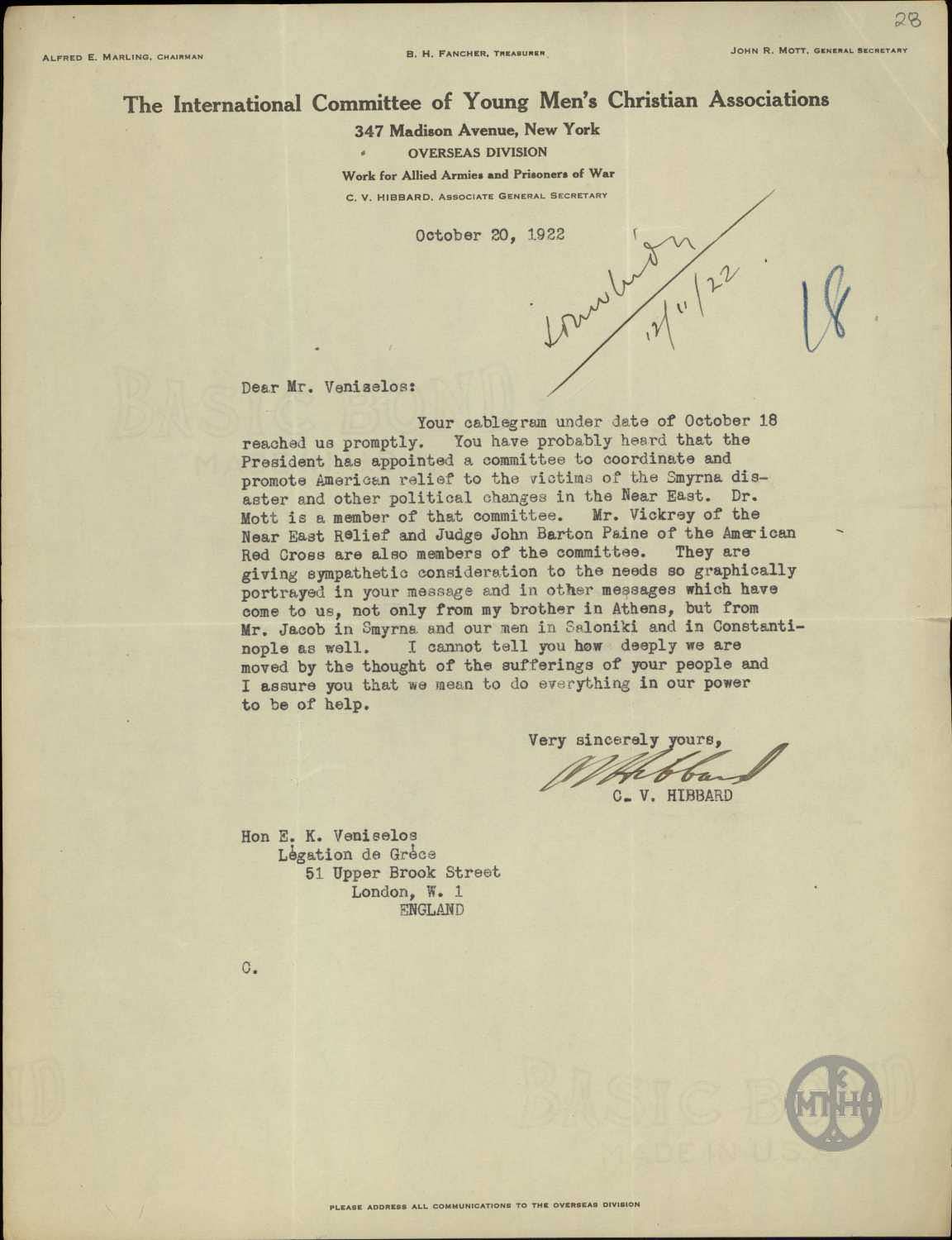 | ΤΙΤΛΟΣ | Επιστολή του C.V.Hibbard προς τον Ε.Βενιζέλο σχετικά με τη δημιουργία επιτροπής για την οργάνωση και προώθηση της αμερικανικής βοήθειας προς τους πρόσφυγες της Μ.Ασίας. |