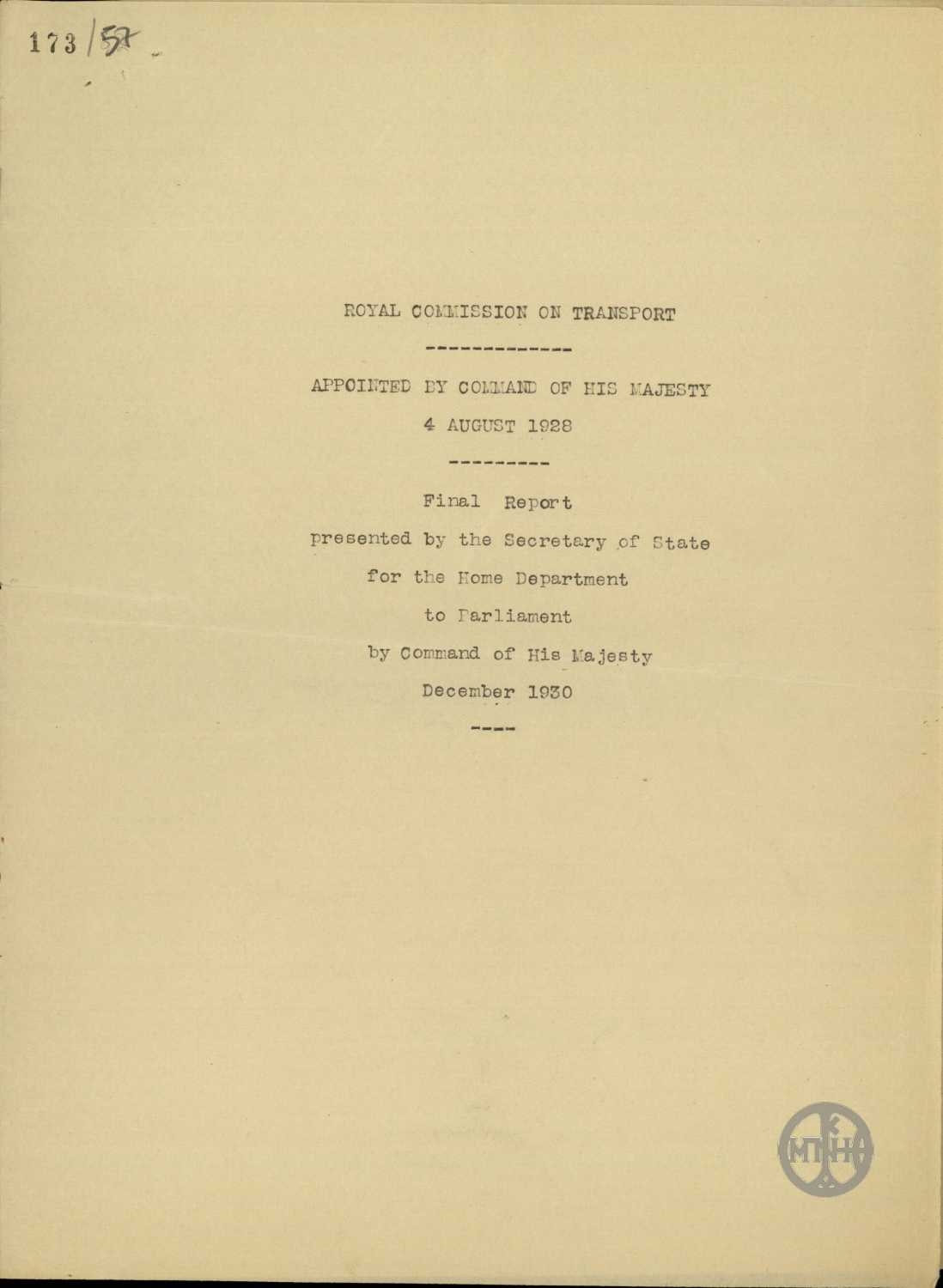 | ΤΙΤΛΟΣ | Έκθεση της Royal Commission on Transport σχετικά με το κυκλοφοριακό και οδικό δίκτυο του Ην. Βασιλείου. |