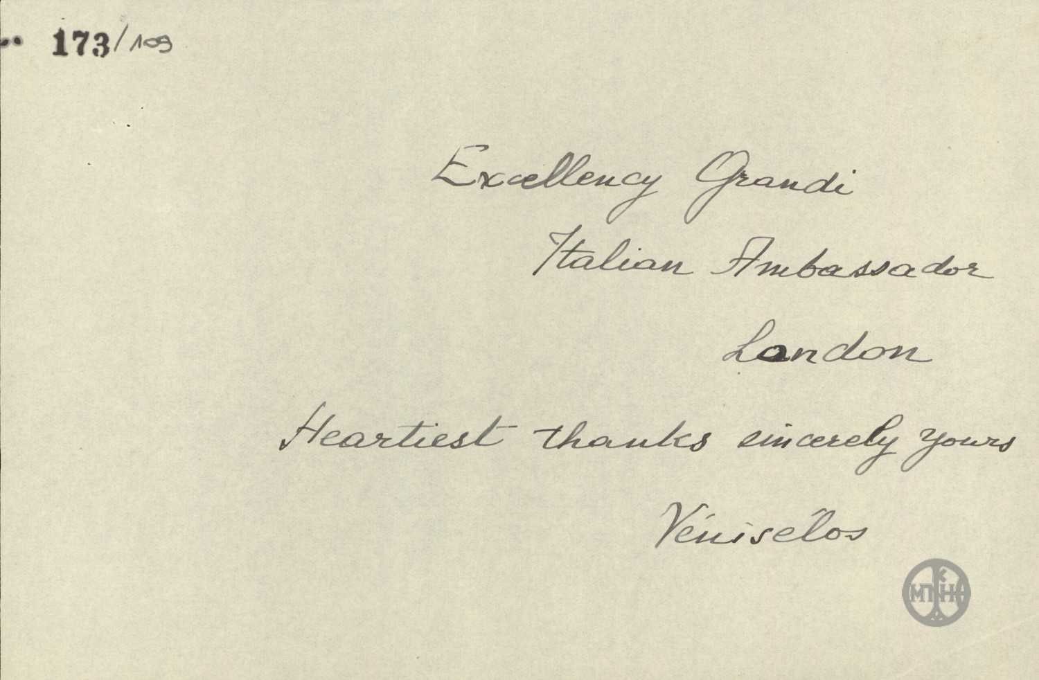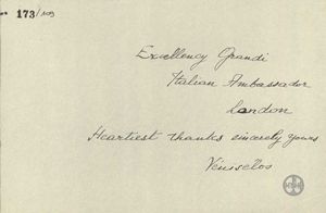 | ΤΙΤΛΟΣ | Τηλεγράφημα του Ε.Βενιζέλου προς τον Πρεσβευτή της Ιταλίας Grandi με το οποίο τον ευχαριστεί για τις ευχές του με αφορμή την απόπειρα δολοφονίας εναντίον του. |