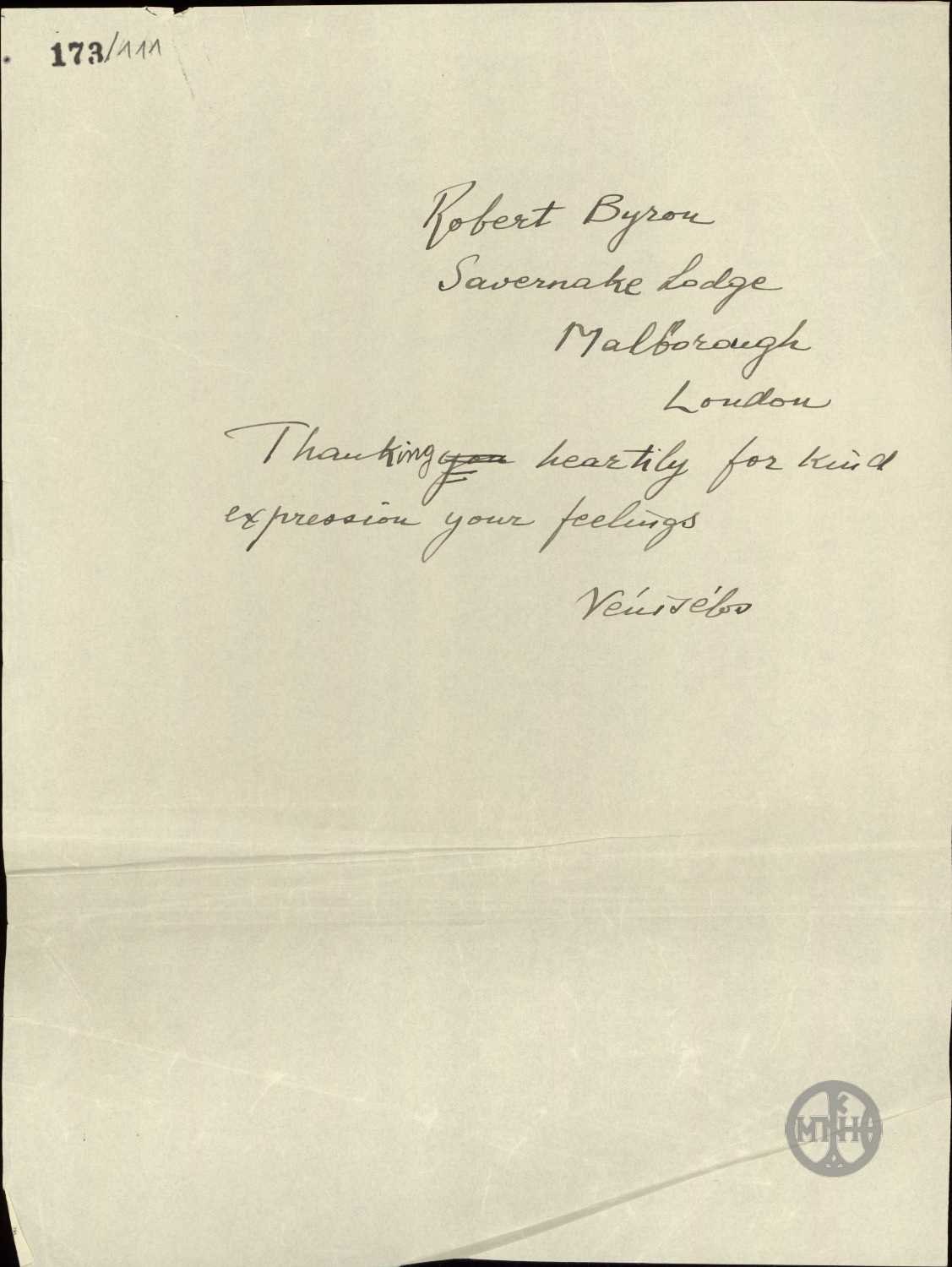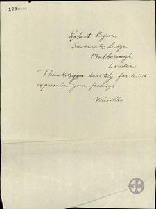 | ΤΙΤΛΟΣ | Τηλεγράφημα του Ε.Βενιζέλου προς τον R.Byron με το οποίο τον ευχαριστεί για την έκφραση των ευγενικών του συναισθημάτων με αφορμή την απόπειρα δολοφονίας εναντίον του. |