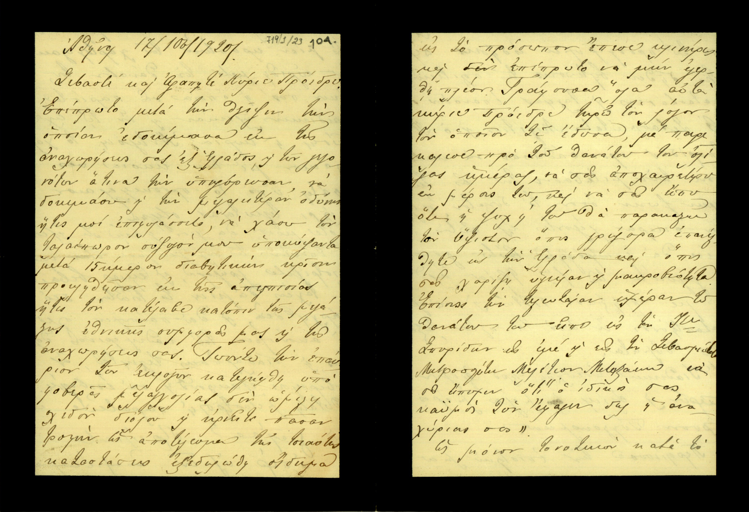 | ΤΙΤΛΟΣ | Επιστολή του Ιωάννη Γεννάδιου προς τον Ελευθέριο Βενιζέλο σχετικά με την αναχώρηση του Βενιζέλου από την Ελλάδα μετά τις εκλογές του 1920, |