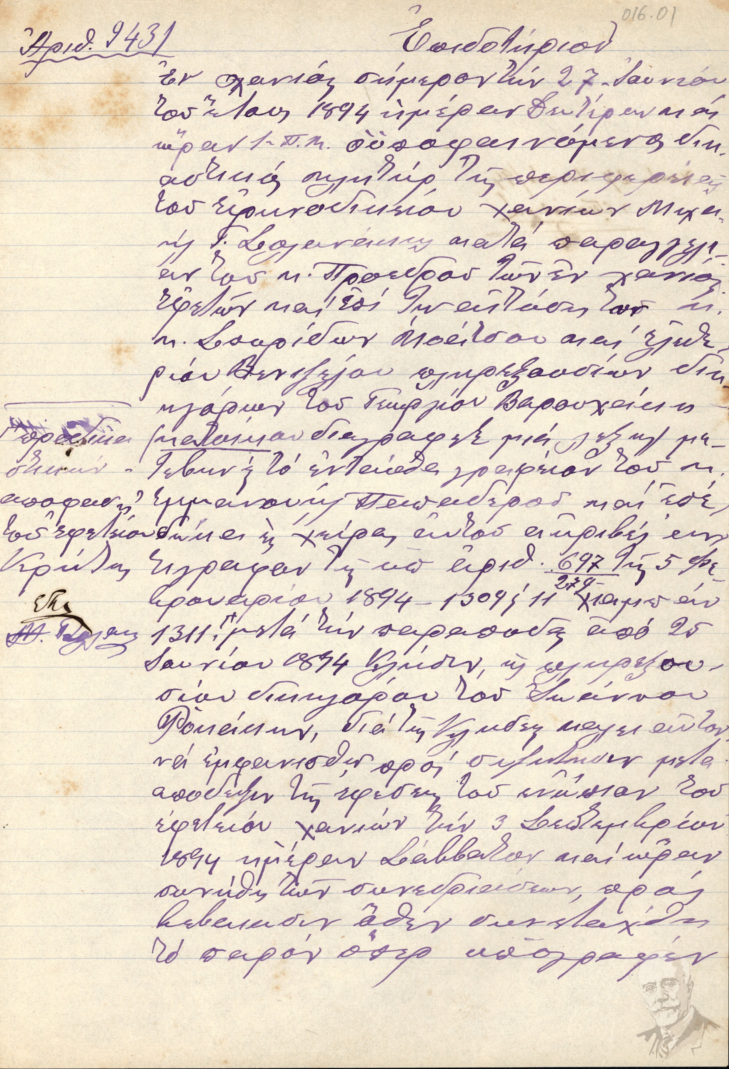 | Τίτλος (Υπόθεση) | Επιδοτήριο με αριθμό 9431 από τους Σπ. Μοάτσο και Ελ. Βενιζέλο, πληρεξούσιους δικηγόρους του Γεωργίου Βαρουχάκη στον Εμμ. Παπαδερό. |