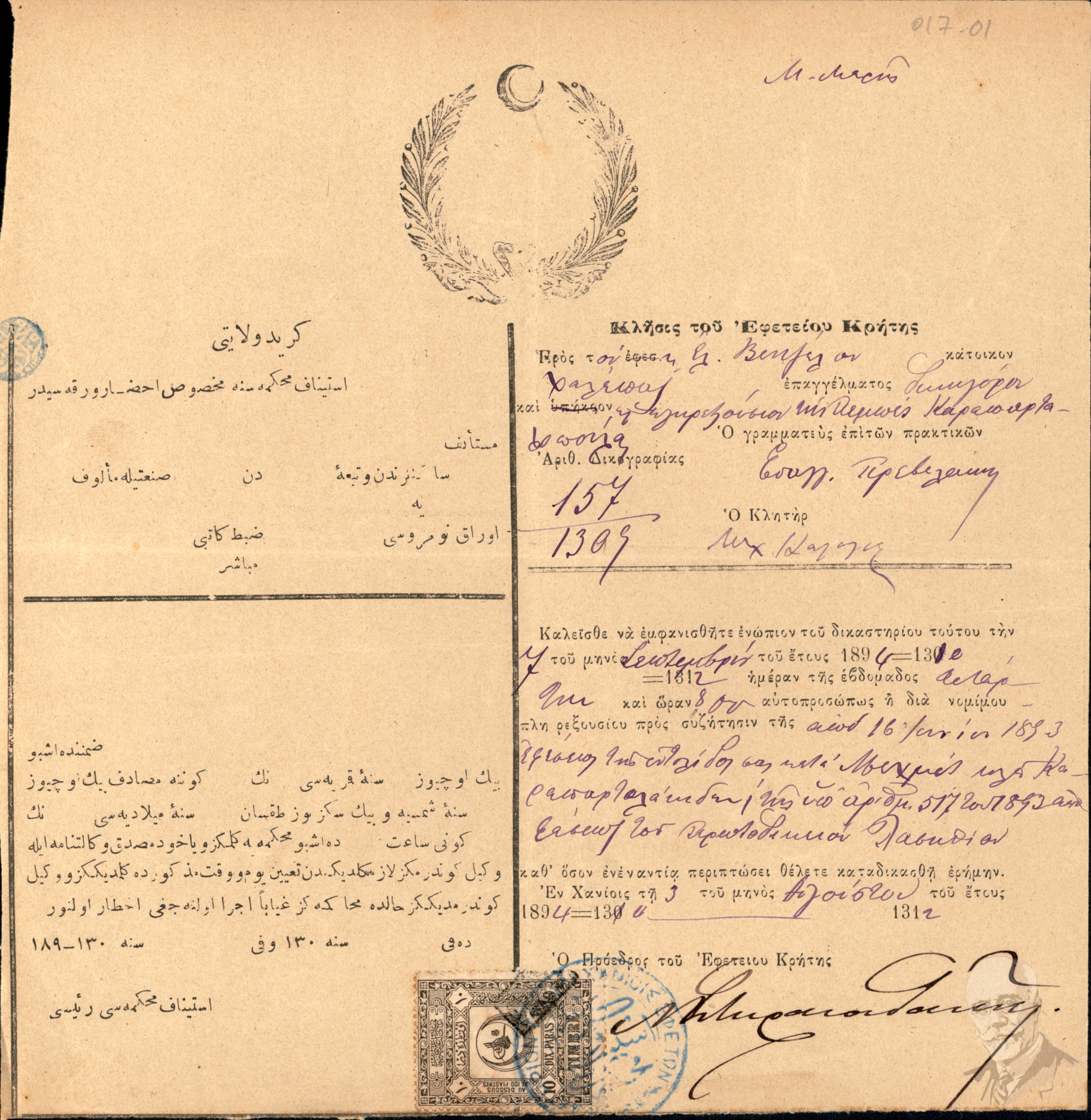 | Τίτλος (Υπόθεση) | Κλήση του εφετείου Κρήτης προς τον Ελ. Βενιζέλο για να παρουσιαστεί στο εφετείο την 16 Ιουνίου 1893 για την υπόθεση Μεχμέτ Καραπαρταλάκη. |