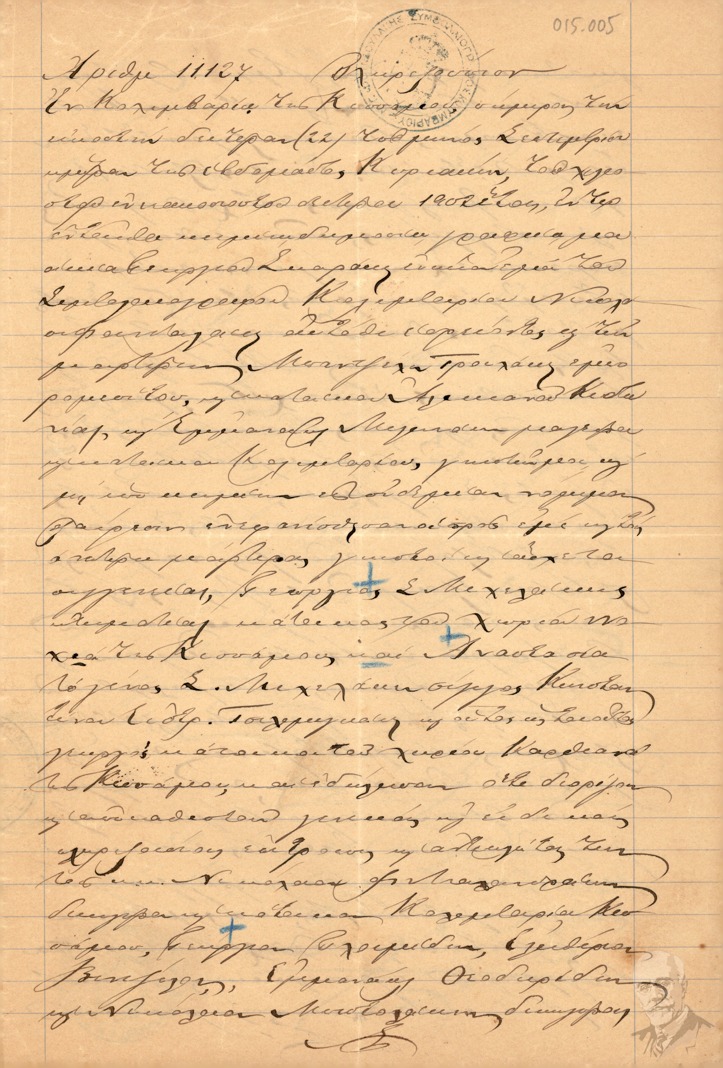 | Τίτλος (Υπόθεση) | Επιδοτήριο με αριθμό 1460 των Ελ. Βενιζέλου και Σπ. Μοάτσου ως πληρεξουσίων των Ελ. Ψαράκη και Κυριακής Κουτσουρελοπούλας προς τον Θεόδωρο Μπασιαδάκη προκειμένου να παραστεί στο δικαστήριο για συζήτηση υπόθεσής τους. |