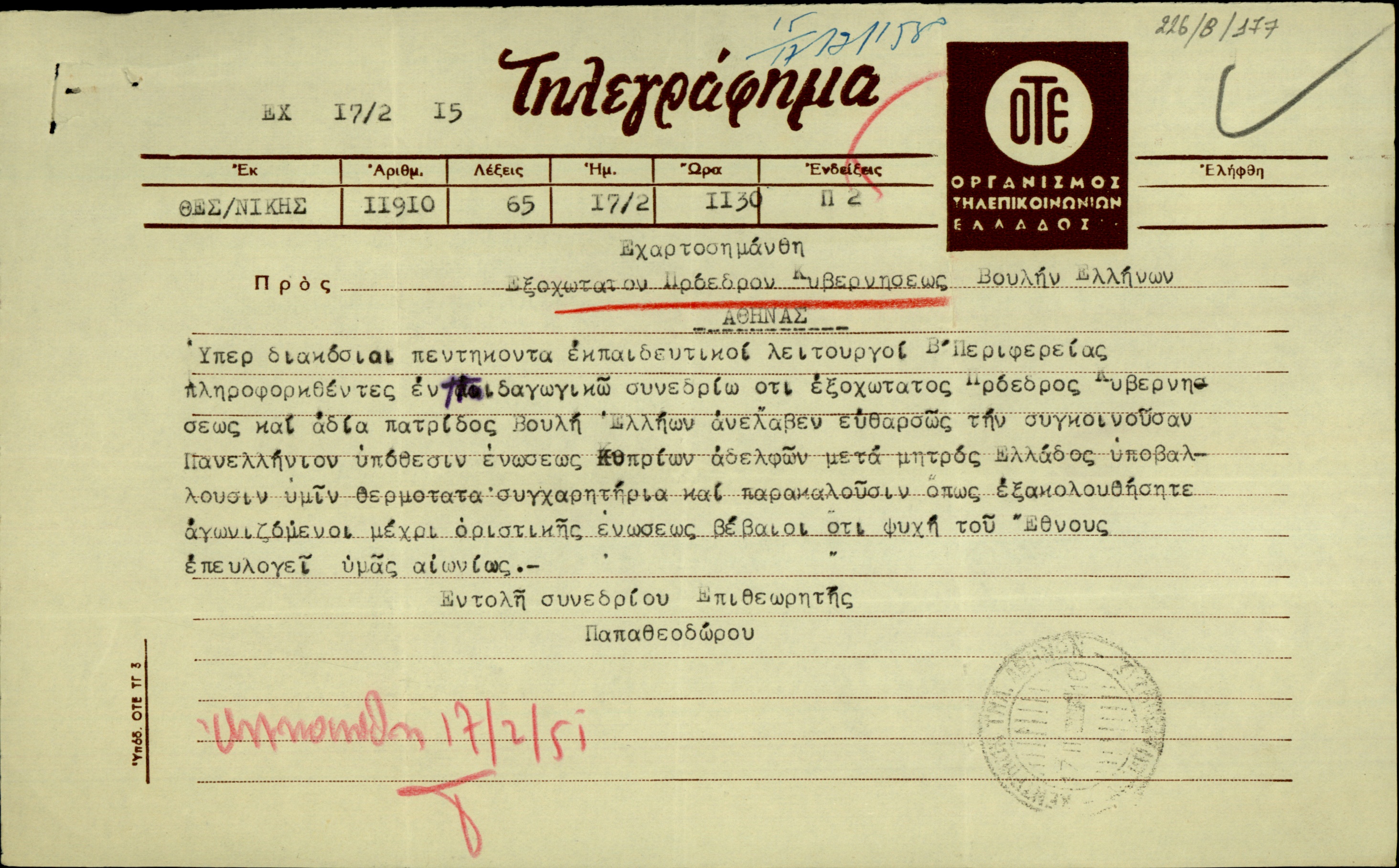 | ΤΙΤΛΟΣ | Τηλεγράφημα του Προέδρου της Ένωσης Αγωνιστών Εθνικής Αντιστάσεως 1941-1944, Ι. Ματσούκα, προς τον Σ. Βενιζέλο με το οποίο εκφράζει την ικανοποίηση της Ένωσης για την πολιτική του στο εθνικό ζήτημα της Κύπρου. |