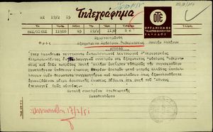 | ΤΙΤΛΟΣ | Τηλεγράφημα του Γραμματέα του Πεζοπορικού Ομίλου Λάρνακας, Δημητρίου, προς τον Σ. Βενιζέλο με το οποίο τον συγχαίρει για τις δηλώσεις της ελληνικής κυβέρνησης υπέρ της ένωσης της Κύπρου με την Ελλάδα. |