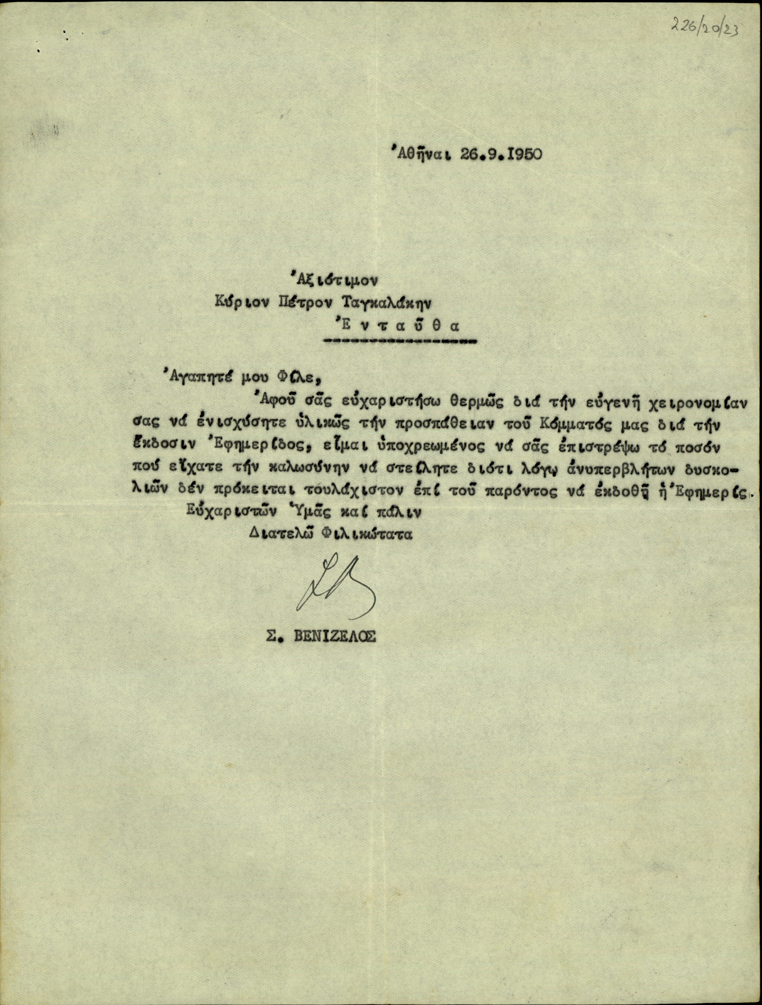 | ΤΙΤΛΟΣ | Επιστολή του Σ. Βενιζέλου προς τον Πέτρο Τσαγκαλάκη με την οποία του επιστρέφει χρηματικό ποσό που του είχε αποστείλει για την έκδοση εφημερίδας εξαιτίας της μη επί του παρόντος έκδοσής της. |