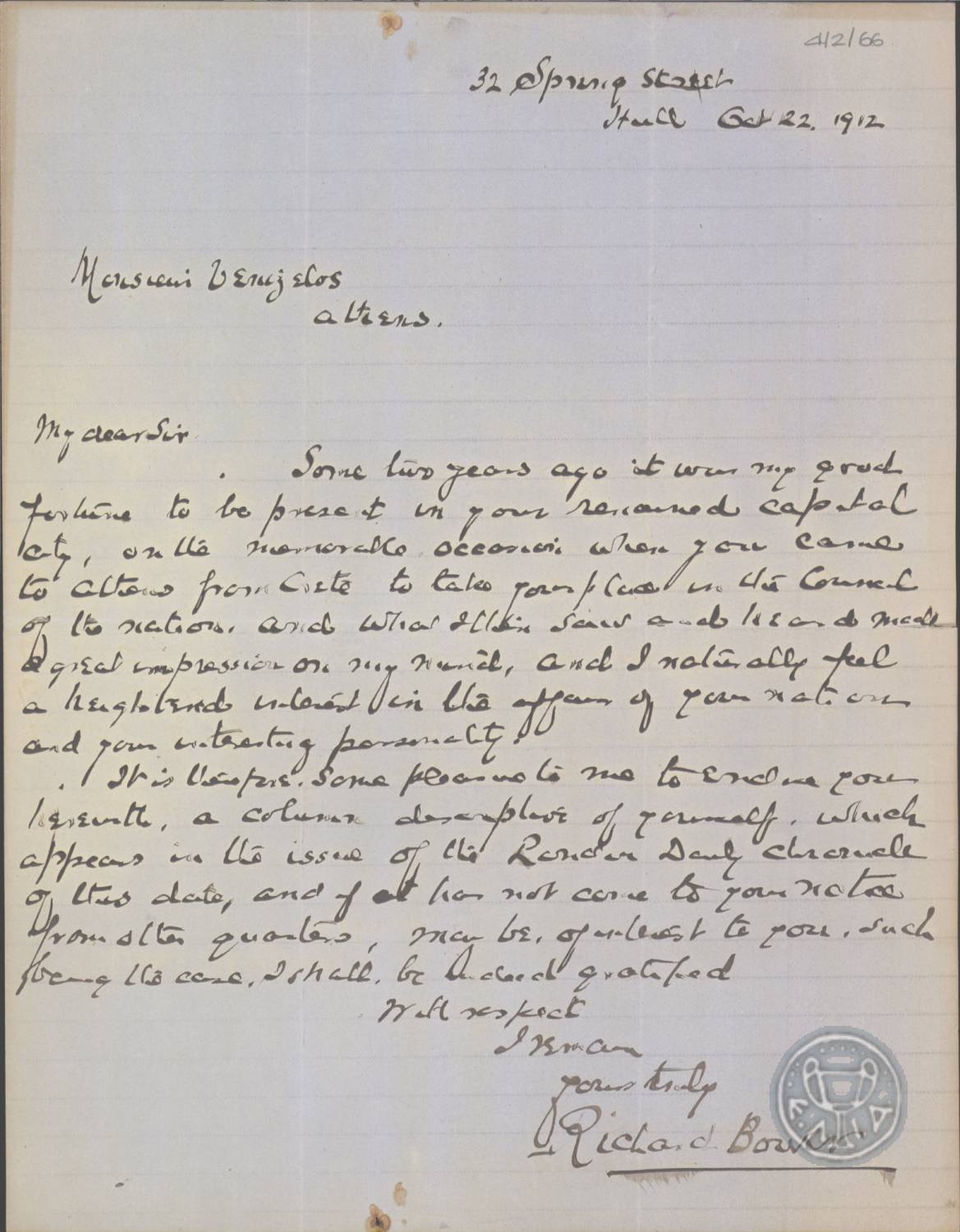 | ΤΙΤΛΟΣ | Επιστολή του R.Bower προς τον Ε.Βενιζέλο, με την οποία διαβιβάζει άρθρο της London Daily Chronicle. |