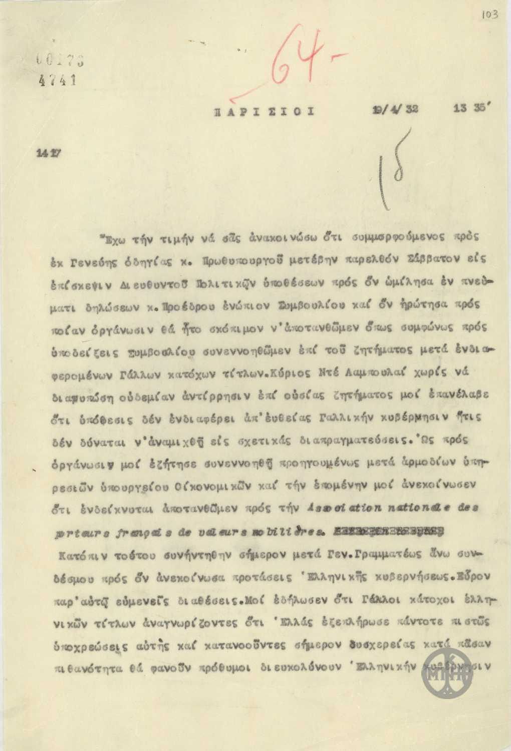 | ΤΙΤΛΟΣ | Τηλεγράφημα του Σ.Μαρκέτη για τον Ε.Βενιζέλο σχετικά με την πιθανότητα παροχής οικονομικής βοήθειας στην Ελλάδα από τη Γαλλία. |