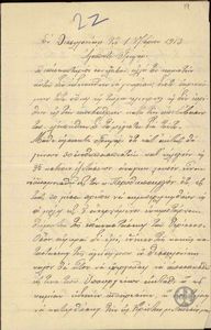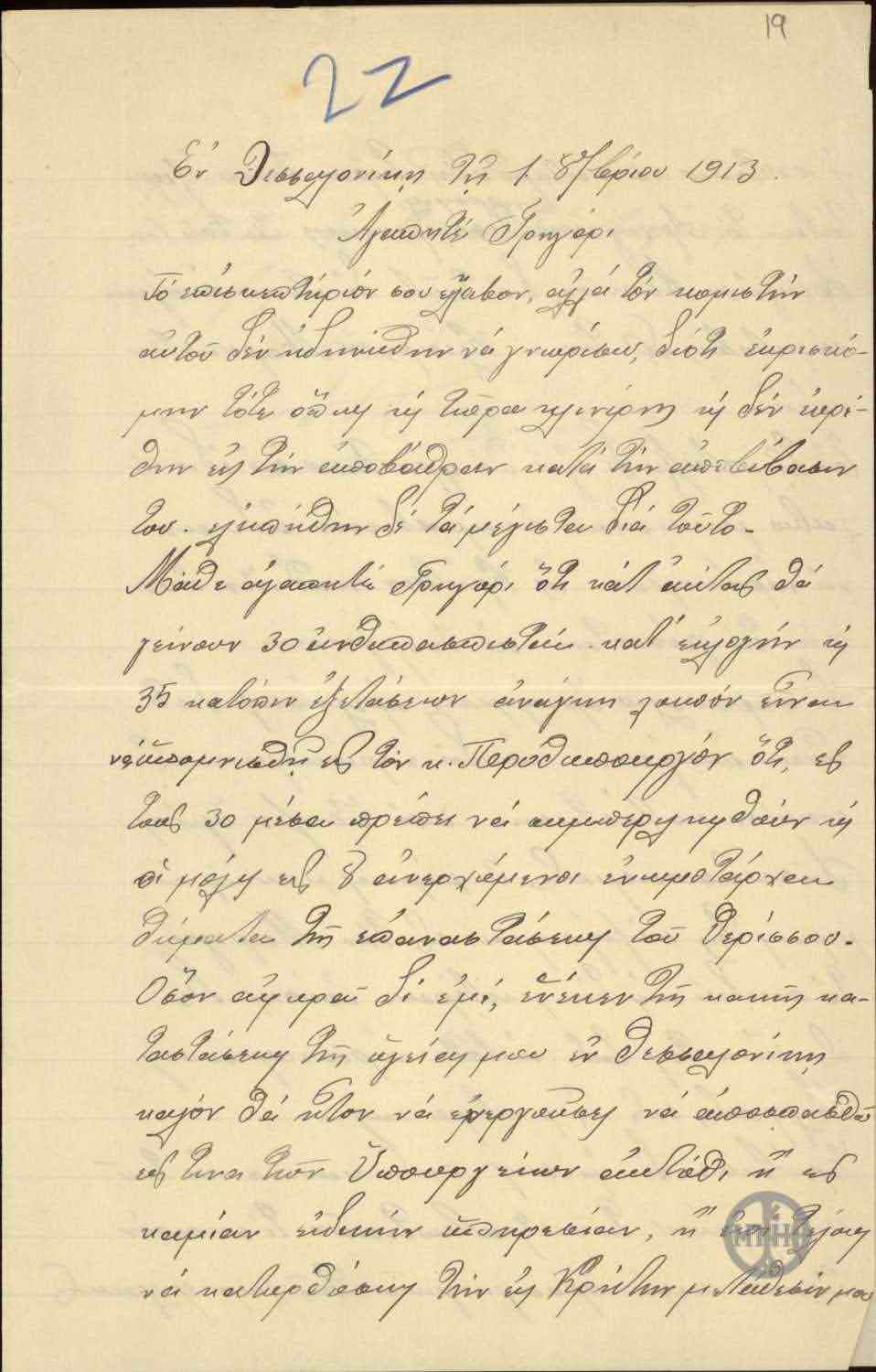 ΤΙΤΛΟΣ | Επιστολή του ενωματάρχη Εμμ.Αντύπα προς τον Ε.Βενιζέλο σχετικά με τις αδικαιολόγητες μεταθέσεις του. |