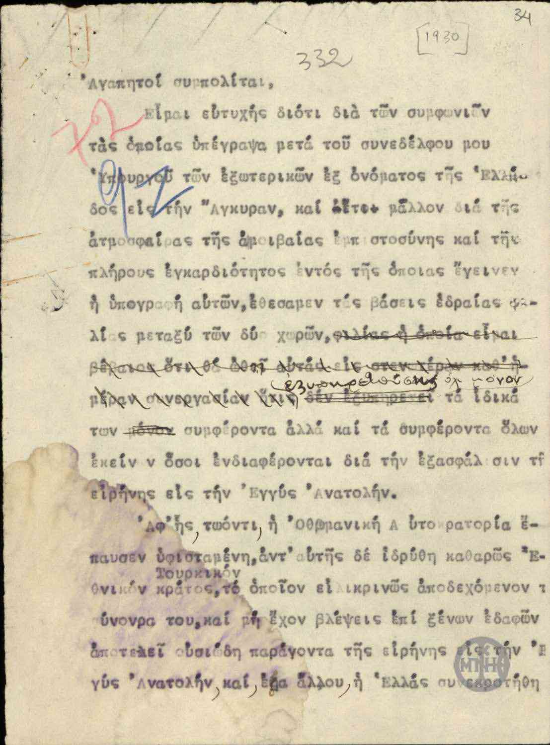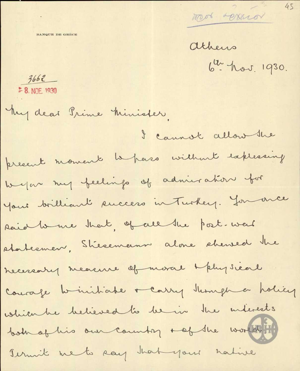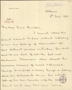 | ΤΙΤΛΟΣ | Συγχαρητήρια επιστολή του Αθ. Ευταξία προς τον Ελ. Βενιζέλο σχετικά με την υπογραφή του ελληνοτουρκικού συμφώνου. |