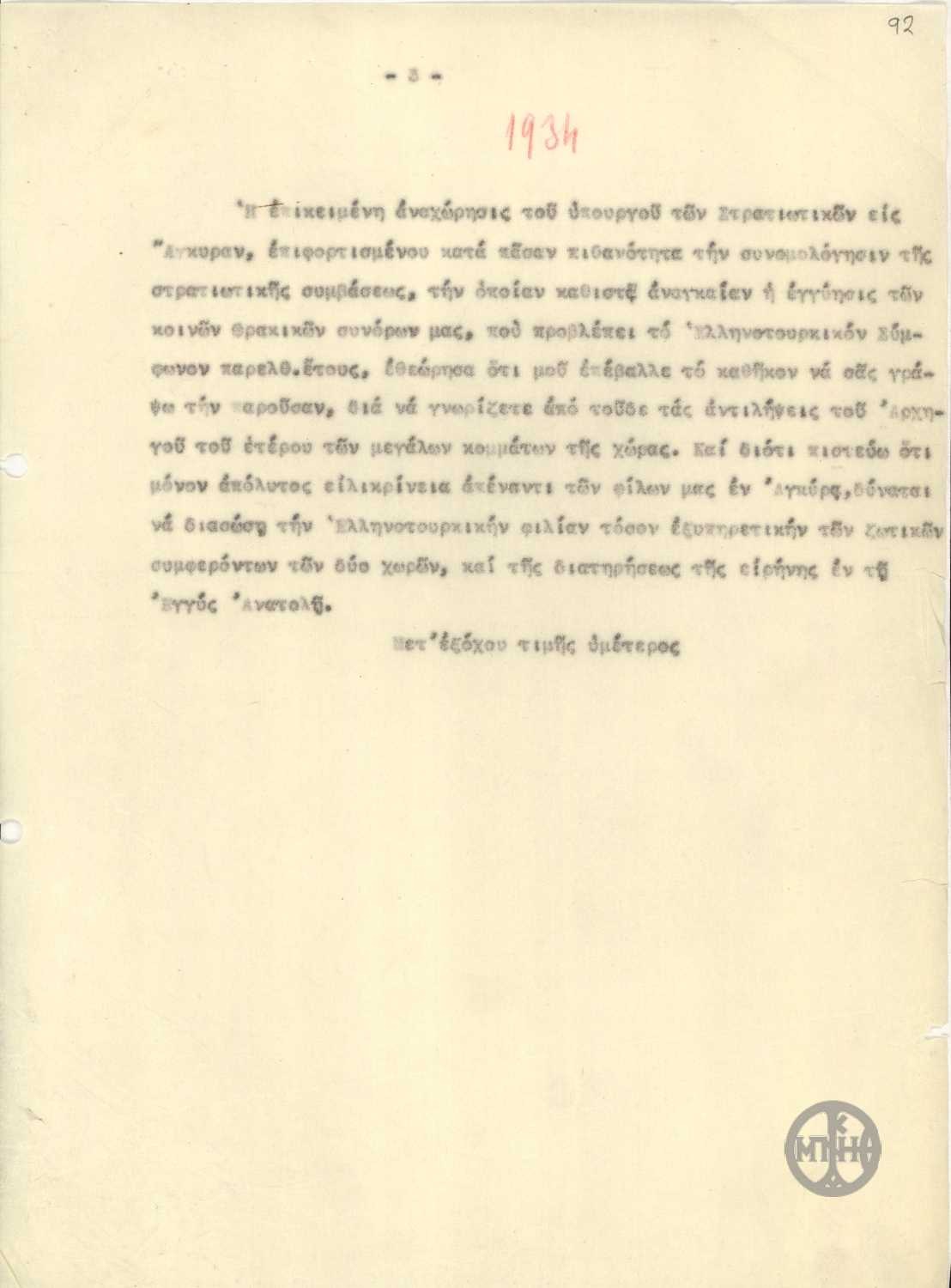 | ΤΙΤΛΟΣ | Επιστολή του Ε. Βενιζέλου σχετικά με την επικείμενη αναχώρηση του υπουργού Στρατιωτικών Γ. Κονδύλη στην Άγκυρα και τη συνομολόγηση στρατιωτικής σύμβασης με την Τουρκία στο πλαίσιο του Ελληνοτουρκικού Συμφώνου και με την ανάγκη ύπαρξης απόλυτης ειλικρίνειας απέναντι των Τούρκων για τη διάσωση της μεταξύ των δύο χωρών φιλίας, την εξυπηρέτηση των ζωτικών συμφερόντων και των δύο καθώς και τη διατήρηση της ειρήνης στην Εγγύς Ανατολή. |