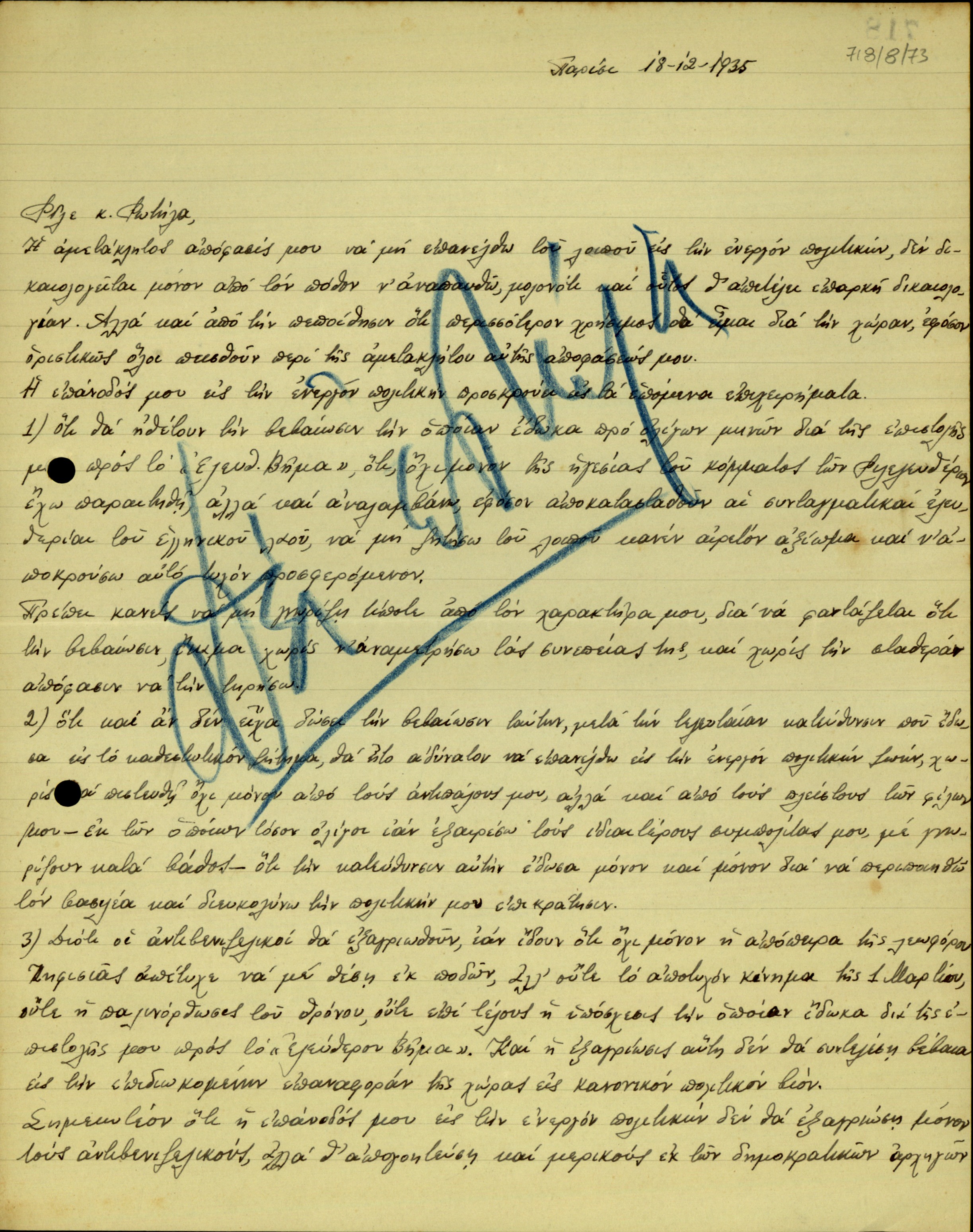 | ΤΙΤΛΟΣ | Επιστολή του Ε. Βενιζέλου προς τον Σπανούδη σχετικά με την απόφασή του για απομάκρυνση από την ενεργό πολιτική και υπό ποιες προϋποθέσεις δεν θα διεκδικήσει κανένα αιρετό αξίωμα. |