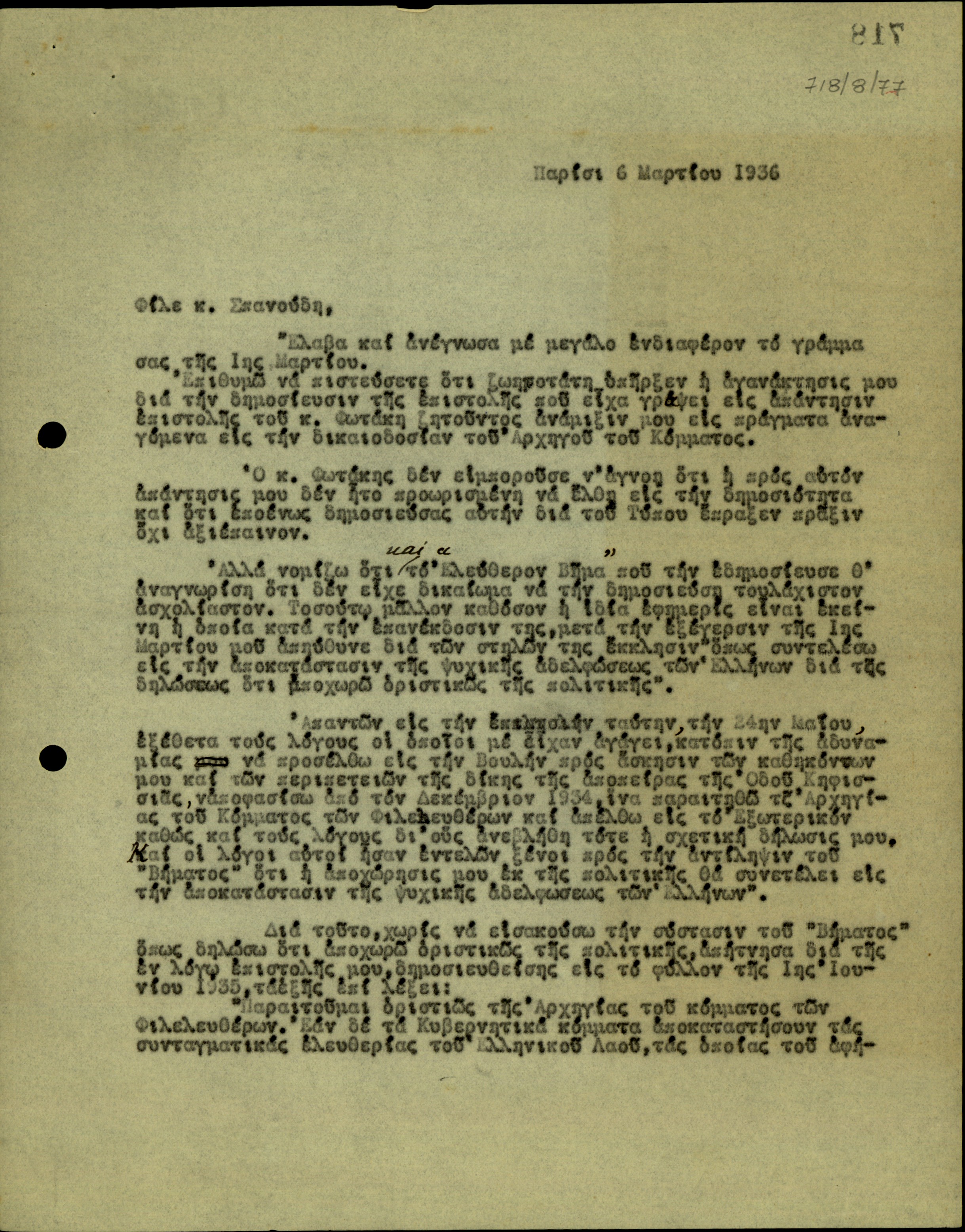 | ΤΙΤΛΟΣ | Επιστολή του Ε. Βενιζέλου προς το Διευθυντή της εφημερίδας Ελεύθερο Βήμα σχετικά με την απόφασή του να παραιτηθεί από την αρχηγία του Κόμματος των Φιλελευθέρων και την απομάκρυνσή του από την ενεργό πολιτική. |