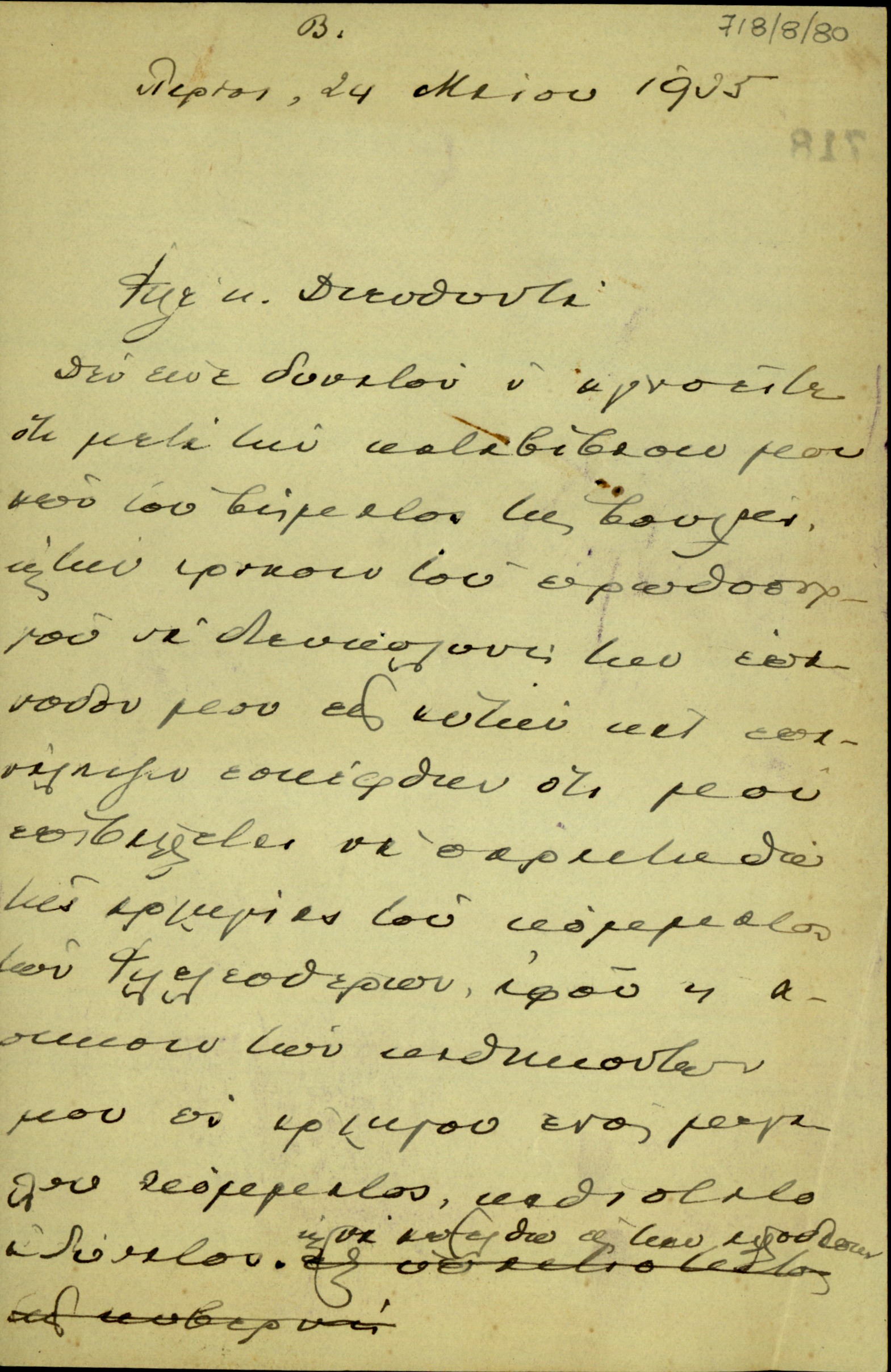 | ΤΙΤΛΟΣ | Επιστολή του Λ. Κασιμάτη σχετικά με την ανάληψη της διεύθυνσης του Κόμματος των Φιλελευθέρων στην Άνδρο από το Θρασύβουλο. |