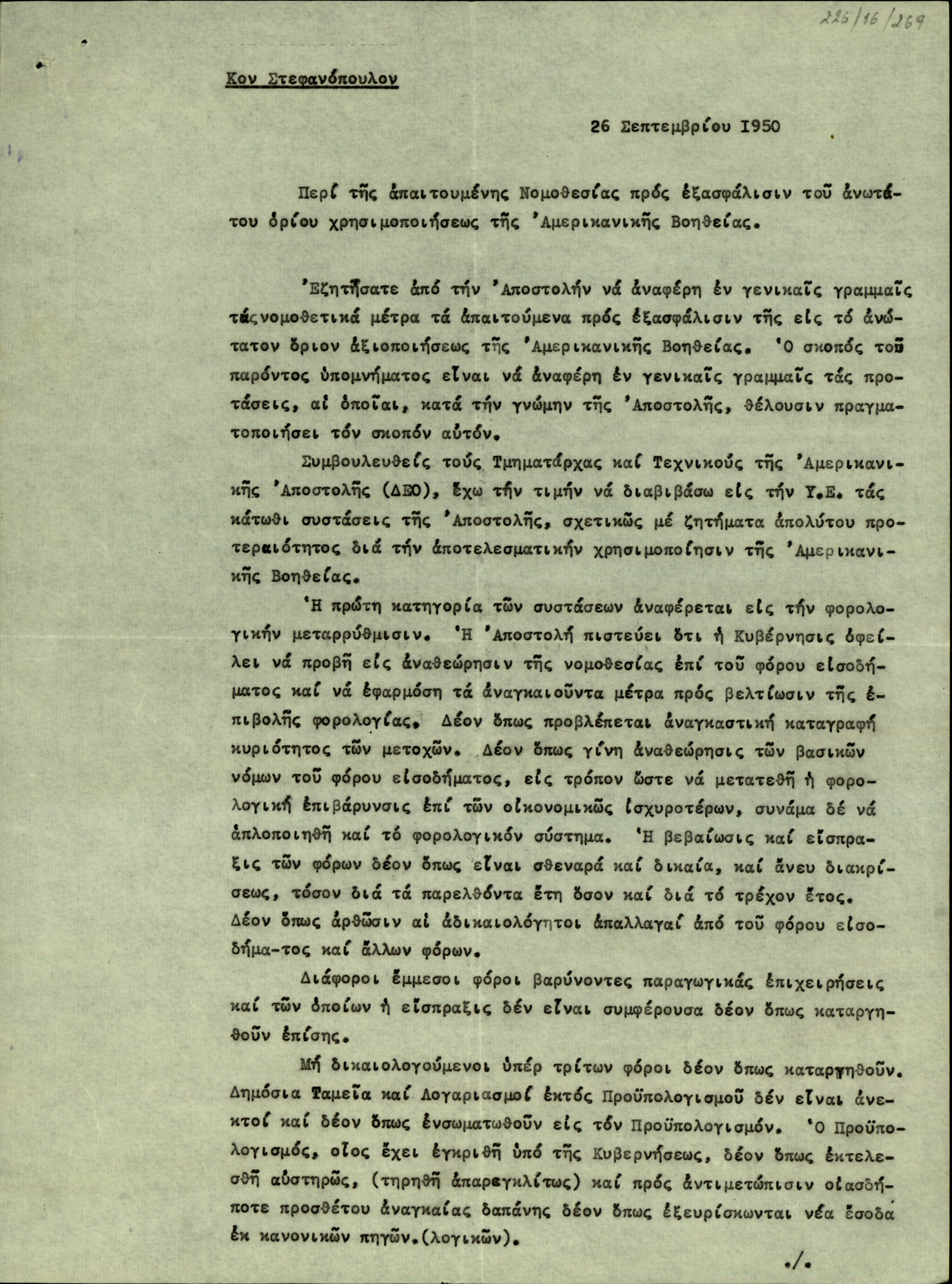 | ΤΙΤΛΟΣ | Επιστολή του J. L. Roach προς τον Στεφανόπουλο σχετικά με την απαιτούμενη νομοθεσία προς εξασφάλιση του ανωτάτου ορίου χρησιμοποιήσεως της Αμεδρικανικής Βοήθειας. |