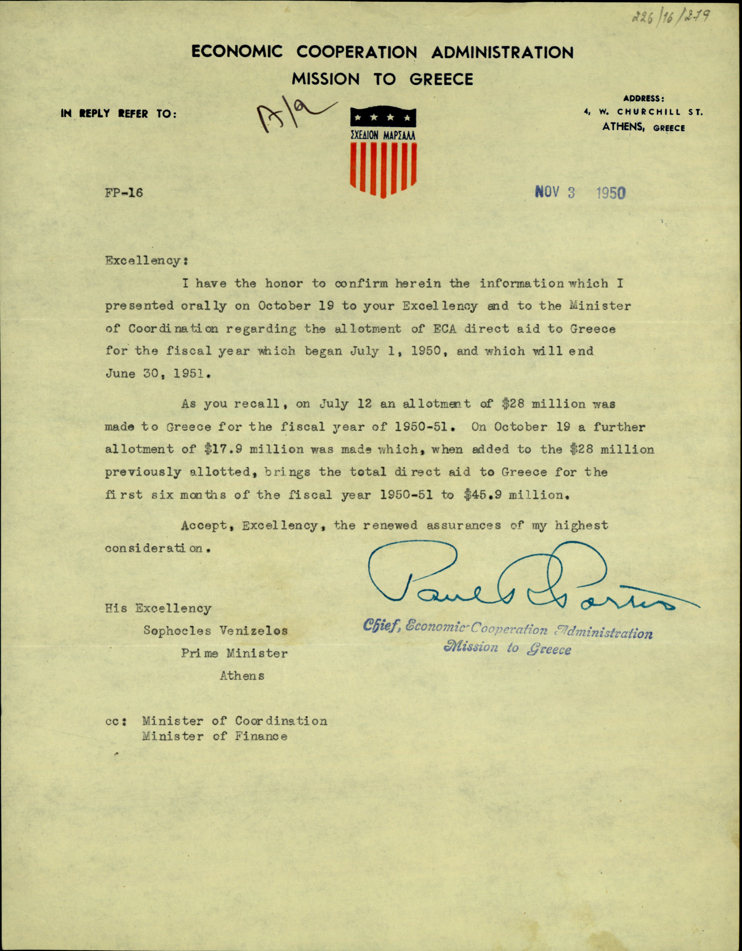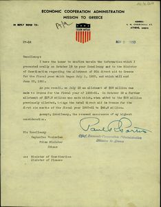 | ΤΙΤΛΟΣ | Επιστολή του Αρχηγού της Αμερικανικής Αποστολής Βόηθειας στην Ελλάδα, Paul P. Porter προς τον Σ. Βενιζέλο |
