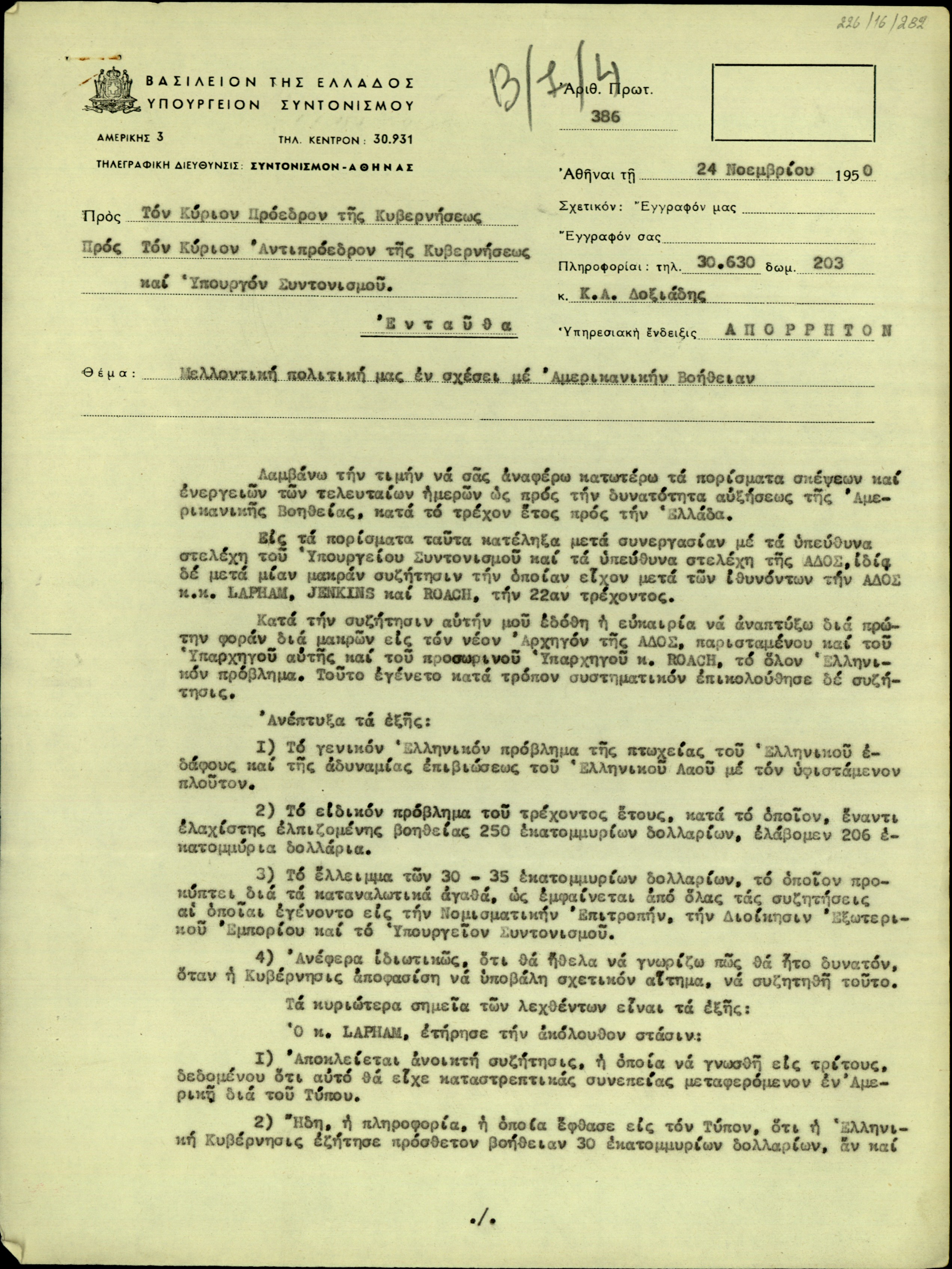 | ΤΙΤΛΟΣ | Επιστολή του Κ. Δ. Δοξιάδη προς τον Πρόεδρο της Ελληνικής Κυβέρνησης, τον Αντιπρόεδρο της Ελληνικής Κυβέρνησης και τον Υπουργό Συντονισμού της Ελλάδας σχετικά με την μελλοντική ελληνική πολιτική για την Αμερικανική βοήθεια. |