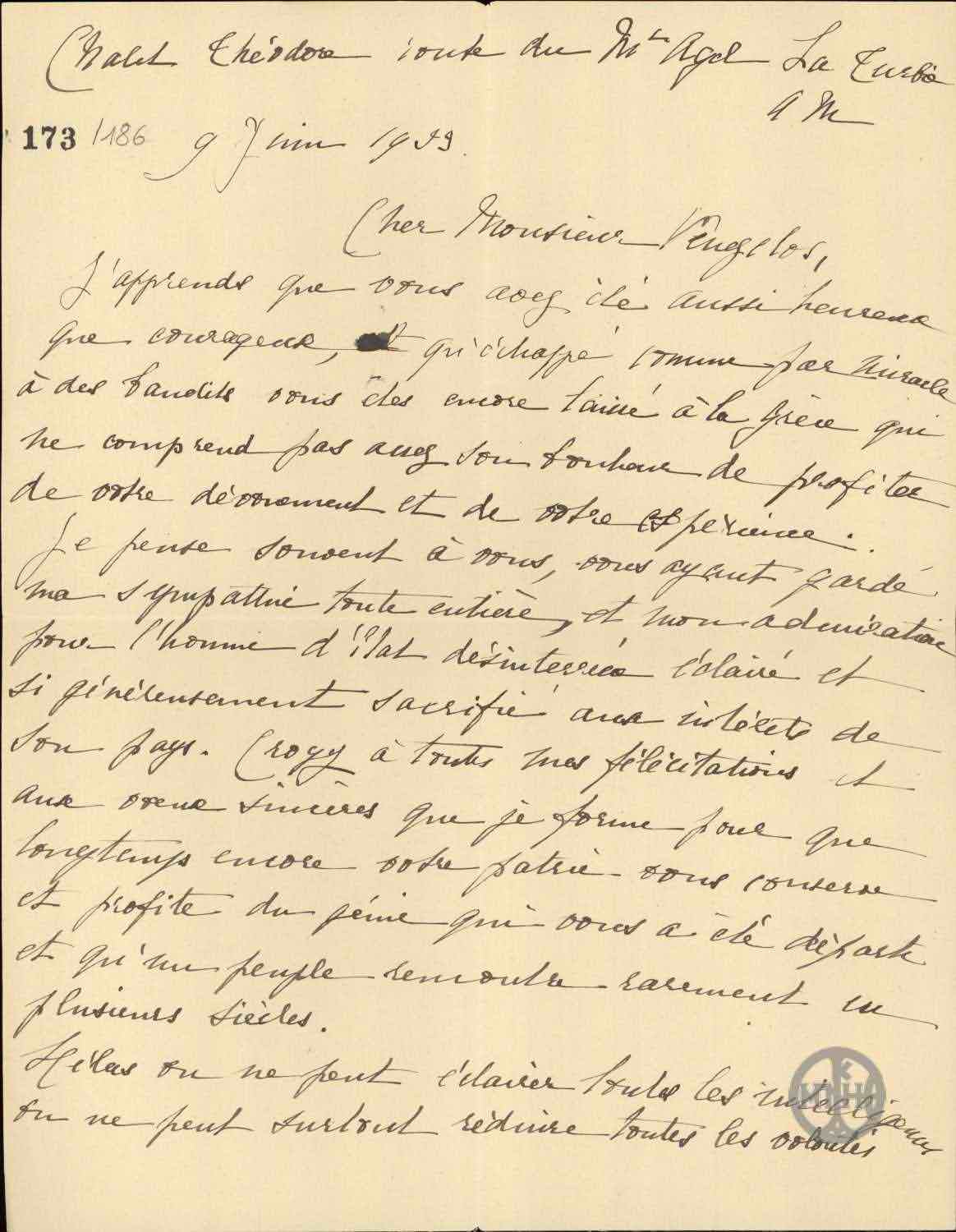 | ΤΙΤΛΟΣ | Επιστολή του Γενικού Γραμματέα του Διεθνούς Γραφείου Εργασίας, H.Golay, προς τον Ε.Βενιζέλο σχετικά με την εναντίον του απόπειρα δολοφονίας. |