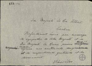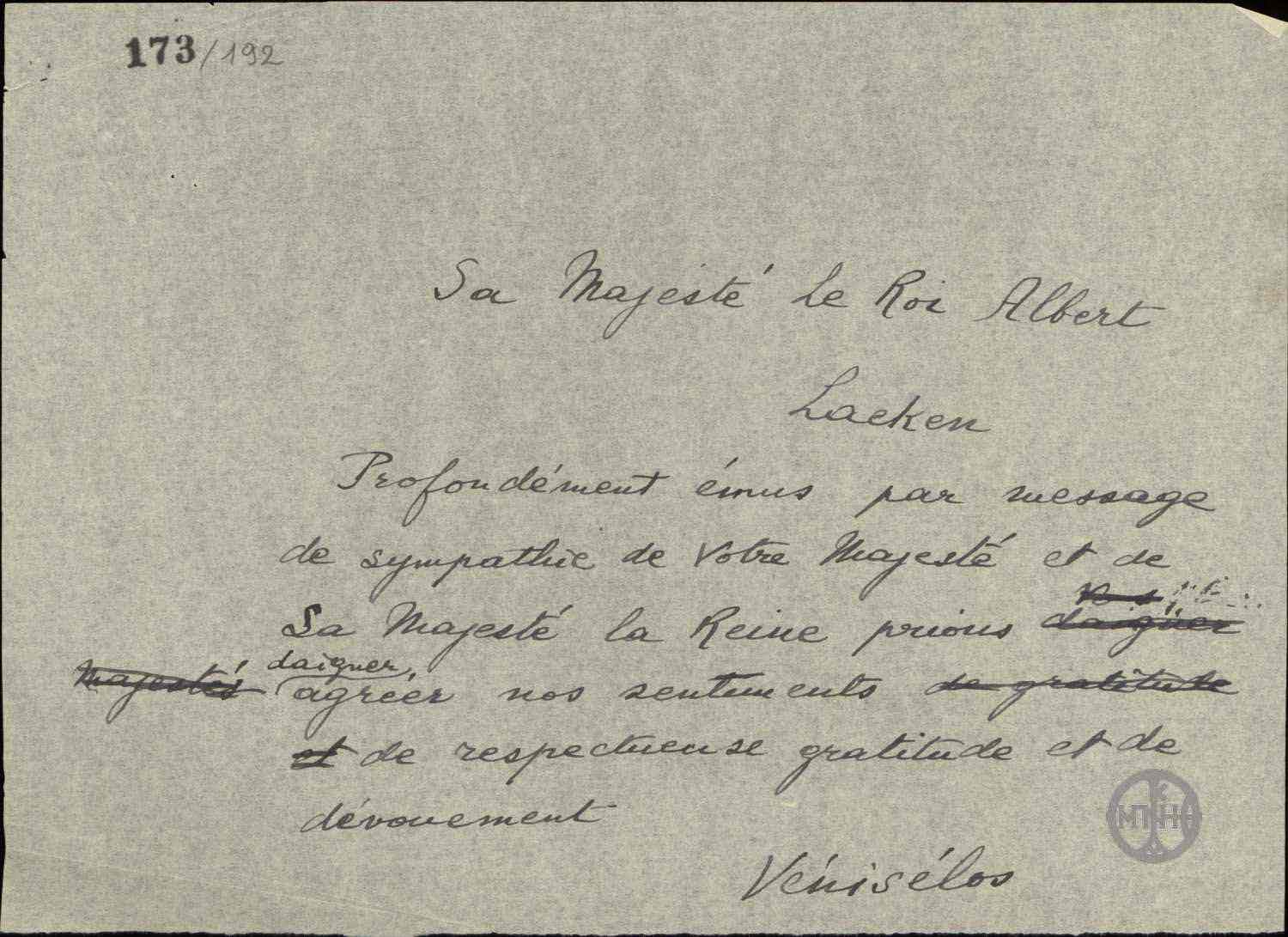 | ΤΙΤΛΟΣ | Τηλεγράφημα του Ε.Βενιζέλου προς τον Albert με το οποίο τον ευχαριστεί για το μήνυμα συμπάθειας για την διάσωσή του από την εναντίον του απόπειρα δολοφονίας. |
