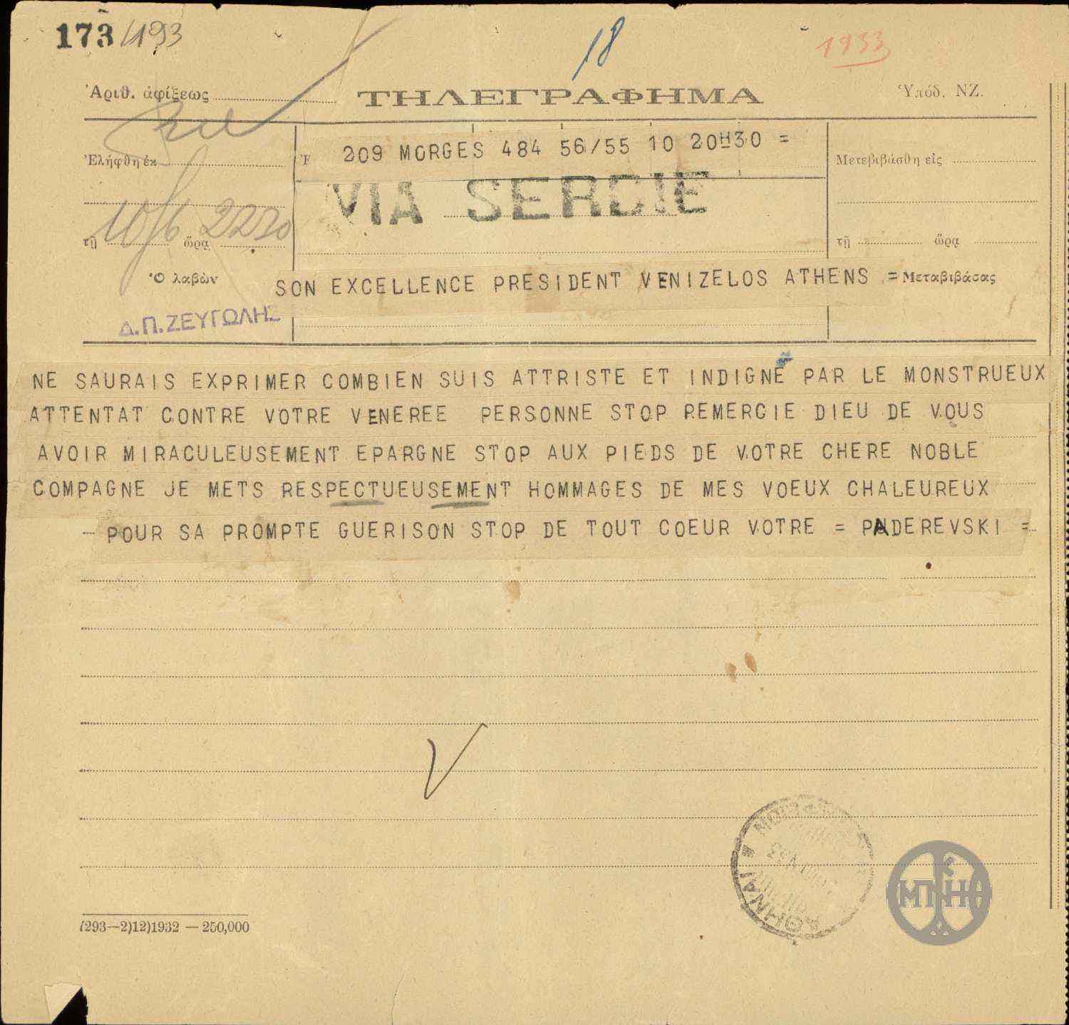 | ΤΙΤΛΟΣ | Τηλεγράφημα του Paderevski προς τον Ε.Βενιζέλο σχετικά με την εναντίον του απόπειρα δολοφονίας. |