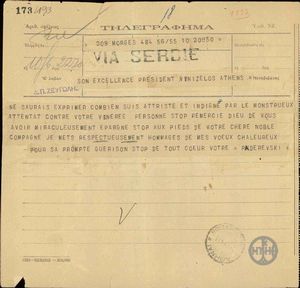 | ΤΙΤΛΟΣ | Τηλεγράφημα του Ε.Βενιζέλου και της Έλενας Βενιζέλου προς τον Paderevski με το οποίο ευχαριστούν για τις ευχές τους για την διάσωσή τους από την εναντίον τους απόπειρα δολοφονίας. |
