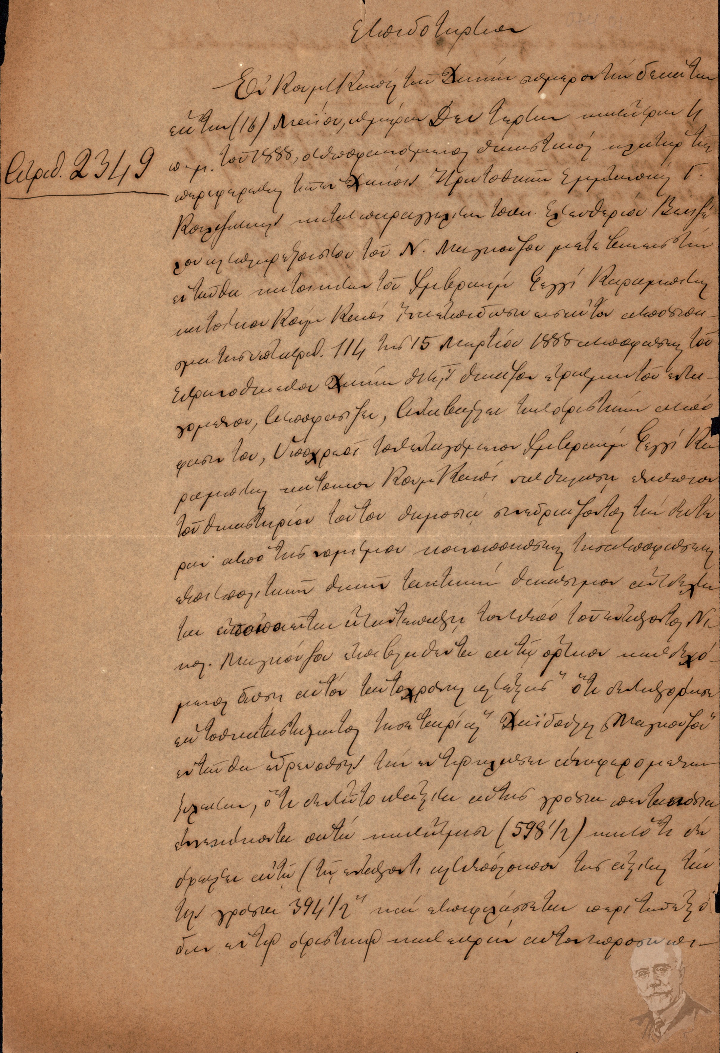 | Τίτλος (Υπόθεση) | Επιδοτήριο με αριθμό 2349 του Ελ. Βενιζέλου ως πληρεξούσιου του Νικόλαου Μαγκούζου προς τον Ιμβραήμ Φεγγί Καραμπίνη προκειμένου να παραστεί στο δικαστήριο για συζήτηση υπόθεσής τους. |