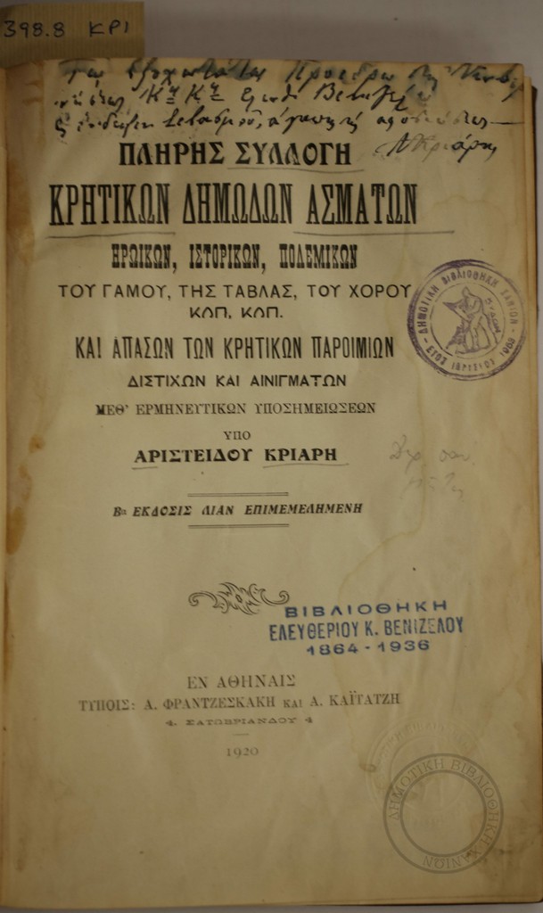 | Κύριος Τίτλος | Πλήρης συλλογή κρητικών δημωδών ασμάτων |