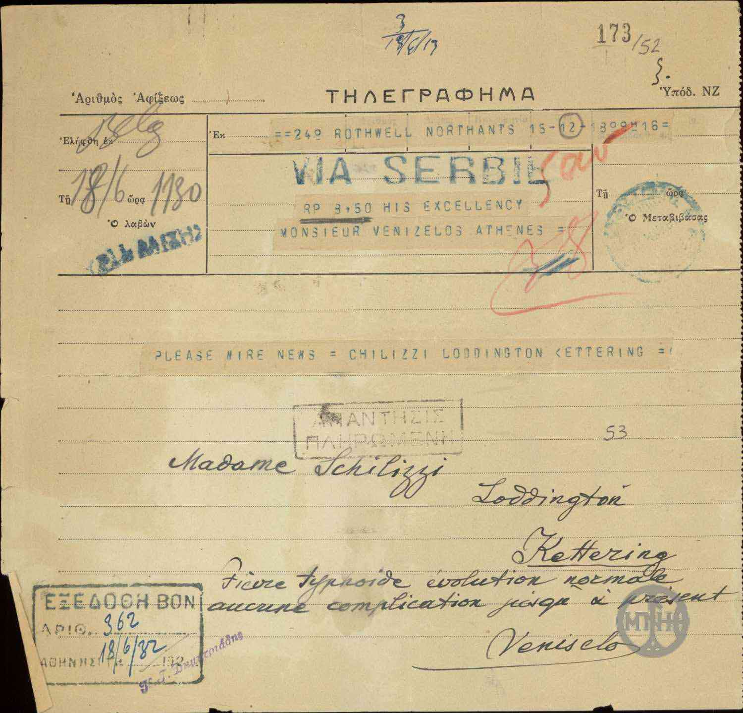 | ΤΙΤΛΟΣ | Τηλεγράφημα της C.Loddington προς τον Ε.Βενιζέλο, με το οποίο του ζητεί να της τηλεγραφήσει νέα. |