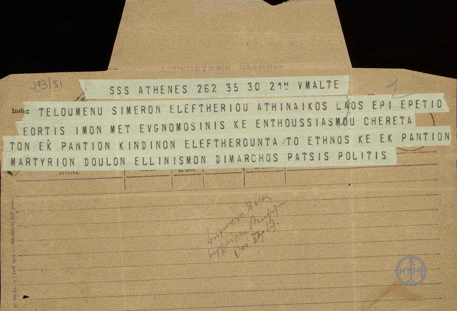 | ΤΙΤΛΟΣ | Τηλεγράφημα του Δημάρχου Αθηνών Σ.Πάτση προς τον Ε.Βενιζέλο, με το οποίο εκφράζει τις ευχές του ιδίου και του αθηναϊκού λαού για την ονομαστική του εορτή. |