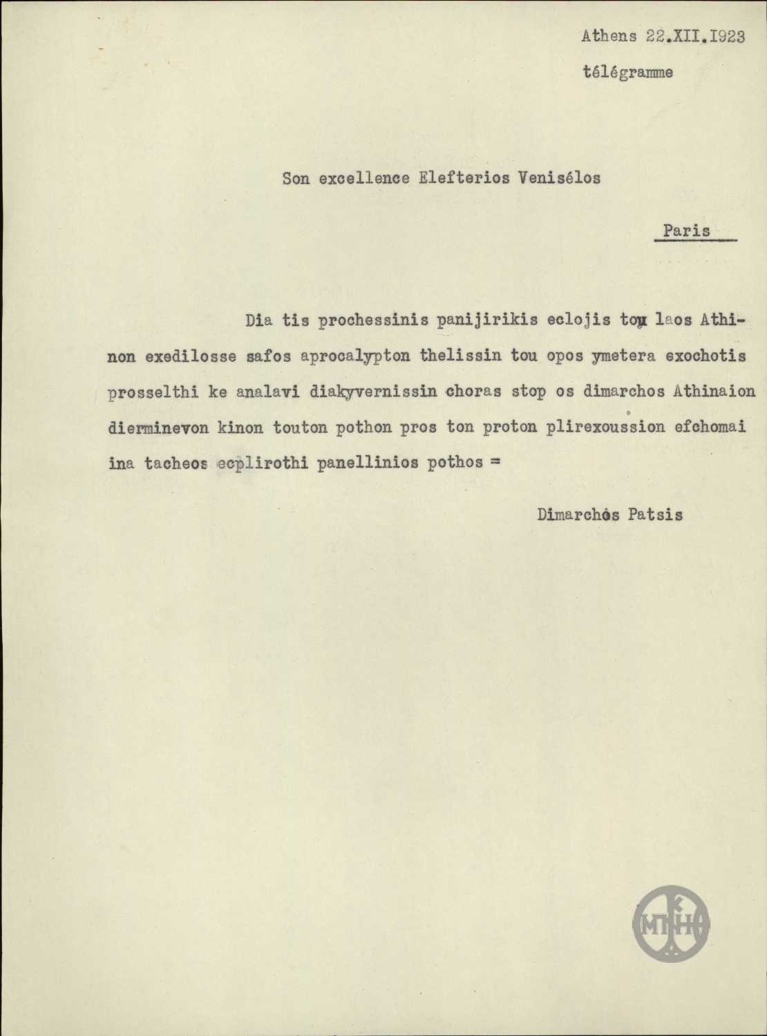 | ΤΙΤΛΟΣ | Τηλεγράφημα του Σ.Πάτση προς τον Ε.Βενιζέλο, με το οποίο μεταφέρει την επιθυμία του λαού των Αθηνών για επιστροφή του Ε.Βενιζέλου στην Ελλάδα. |