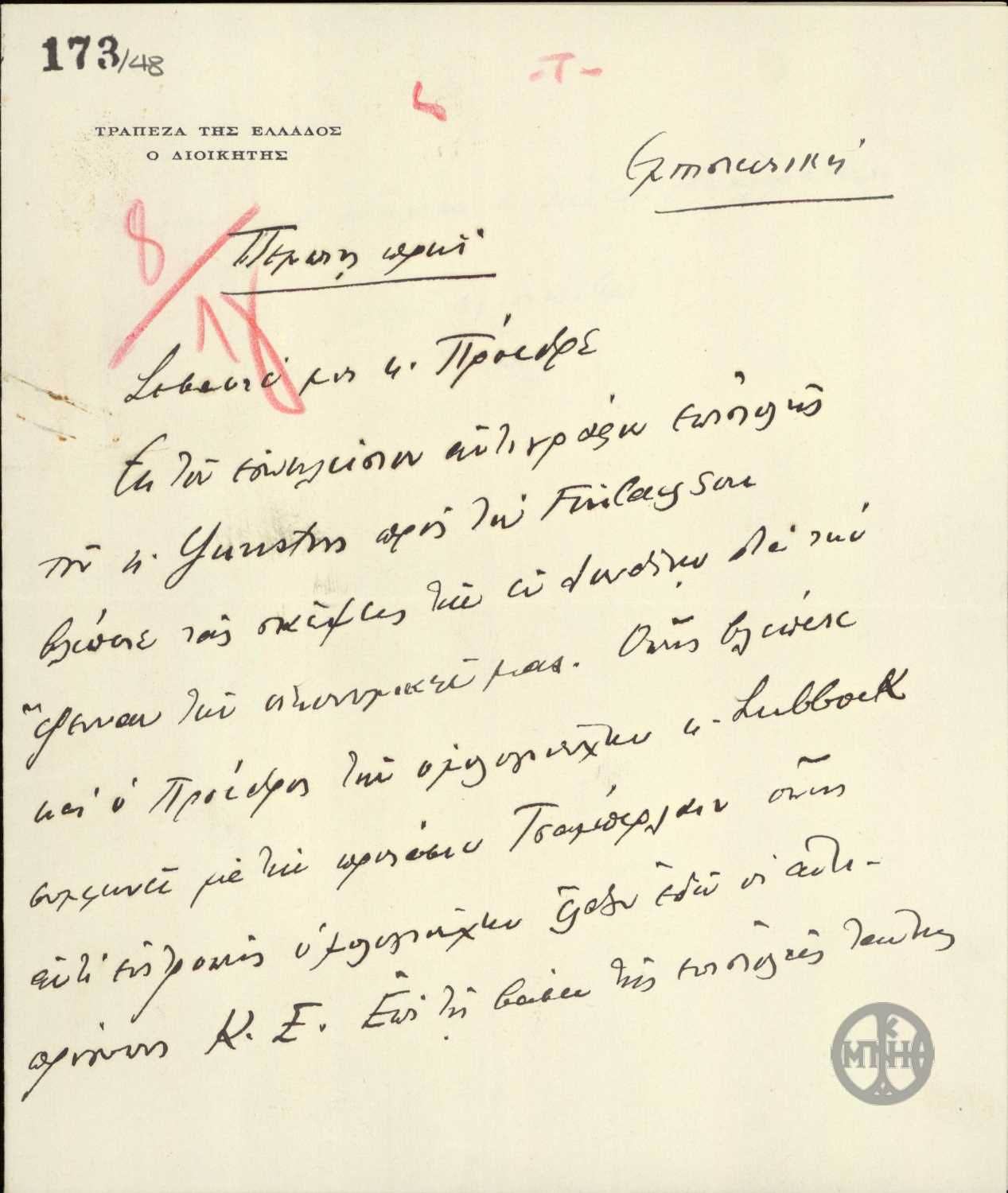 | ΤΙΤΛΟΣ | Επιστολή του Διοικητή της Τράπεζας της Ελλάδος, Εμμ.Τσουδερού, προς τον Ε.Βενιζέλο σχετικά με την στάση του Μάξιμου. |