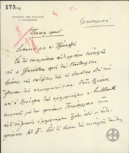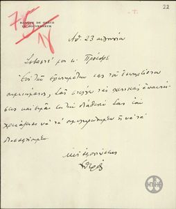 | ΤΙΤΛΟΣ | Επιστολή του Διοικητή της Τράπεζας της Ελλάδος, Εμμ.Τσουδερού, προς τον Ε.Βενιζέλο σχετικά με το ζήτημα της φορολογίας της Τράπεζας. |
