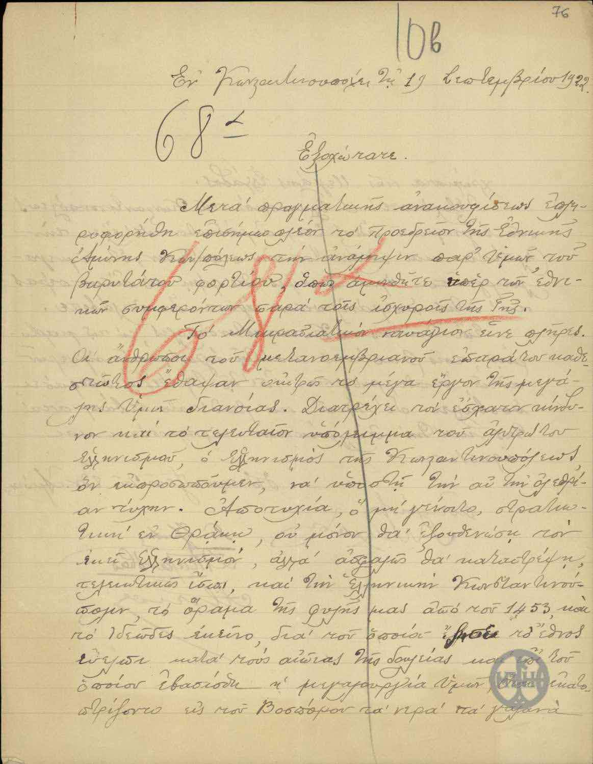| ΤΙΤΛΟΣ | Επιστολή του Προεδρείου της Εθνικής Αμύνης Κωνσταντινούπολης προς τον Ε.Βενιζέλο σχετικά με την ανάληψη εκ μέρους του της εκπροσώπησης της Ελλάδας στο εξωτερικό. |