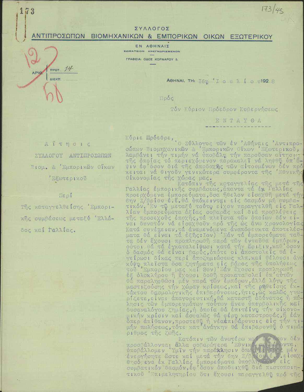 | ΤΙΤΛΟΣ | Αίτηση-Επιστολή του Συλλόγου Αντιπροσώπων Βιομηχανικών & Εμπορικών Οίκων Εξωτερικού στον Ε. Βενιζέλο σχετικά με τη ανάγκη δασμολόγησης εισαγόμενων προϊόντων ύστερα από την καταγγελία ελληνογαλλικής εμπορικής συμβάσεως |