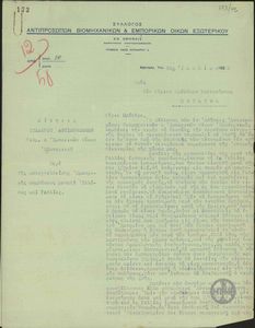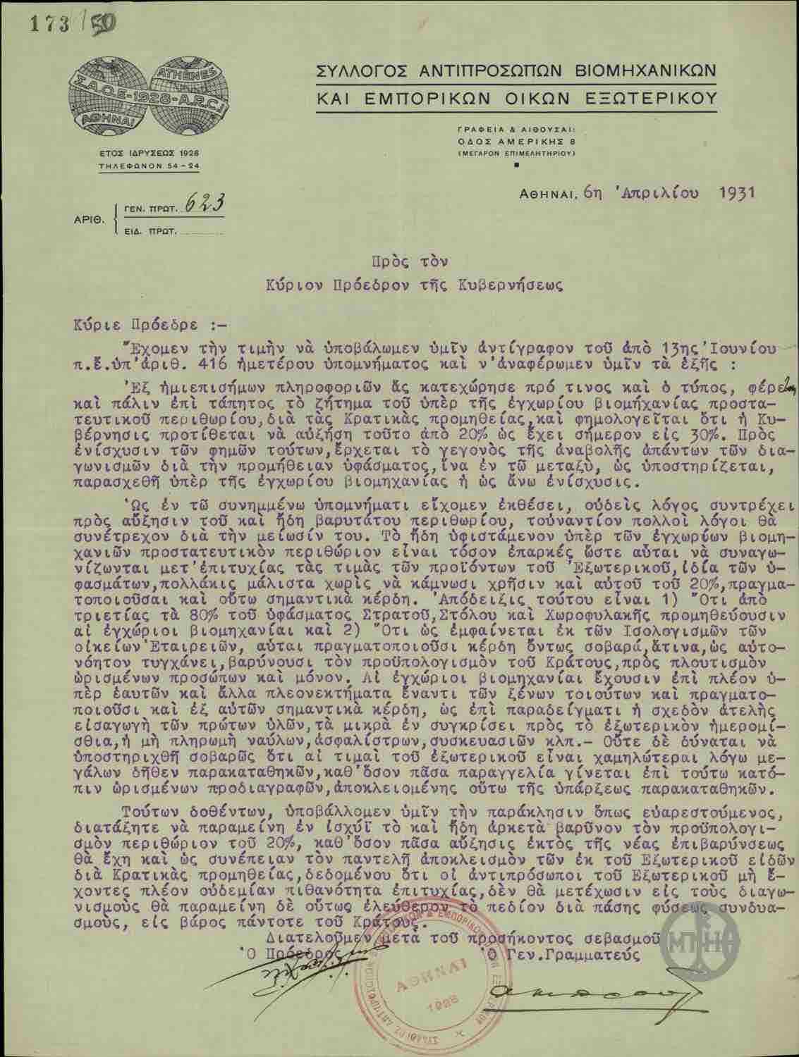 | ΤΙΤΛΟΣ | Επιστολή διαμαρτυρίας του Συλλόγου αντιπροσώπων βιομηχανικών και εμπορικών οίκων του εξωτερικού προς τον Ε. Βενιζέλο με την οποία του διαβιβάζουν υπόμνημα για το ζήτημα αύξησης από το υφιστάμενο 20% του προστατευτικού περιθωρίου της εγχωρίου βιομηχανίας για τις κρατικές προμήθειες στο 30%. |