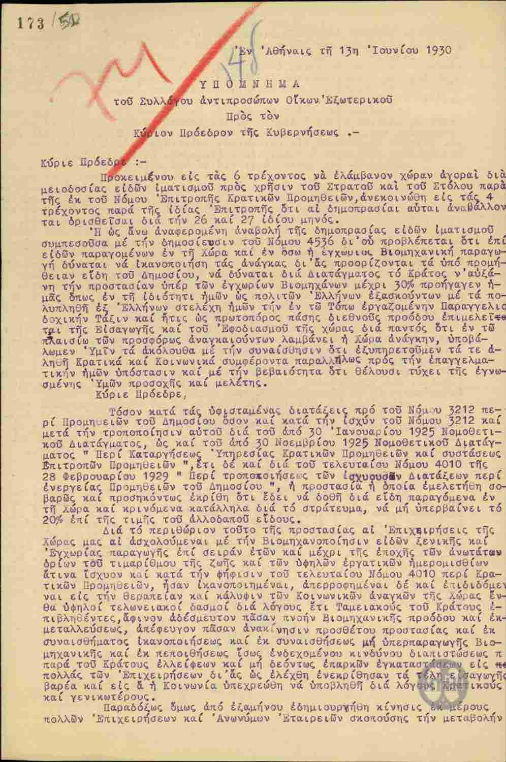 | ΤΙΤΛΟΣ | Υπόμνημα του Συλλόγου αντιπροσώπων βιομηχανικών και εμπορικών οίκων εξωτερικού προς τον Ε. Βενιζέλο με το οποίο αιτούνται να μην εφαρμοσθεί ο νόμος 4536 ο οποίος προβλέπει αύξηση μέχρι 30% του περιθωρίου του συγκριτικού κόστους εγχώριας κατεργασίας έναντι της αλλοδαπής. |