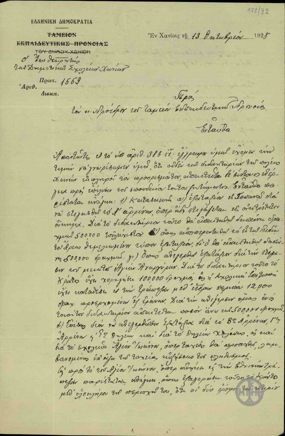 ΤΙΤΛΟΣ | Επιστολή του Επιθεωρητή Δημοτικών Σχολείων Χανίων, Ζαγοριανάκη, προς τον Πρόεδρο του Ταμείου Εκπαιδευτικής Προνοίας σχετικά με διάφορες ελλείψεις στα σχολεία του Δήμου Χανίων. |