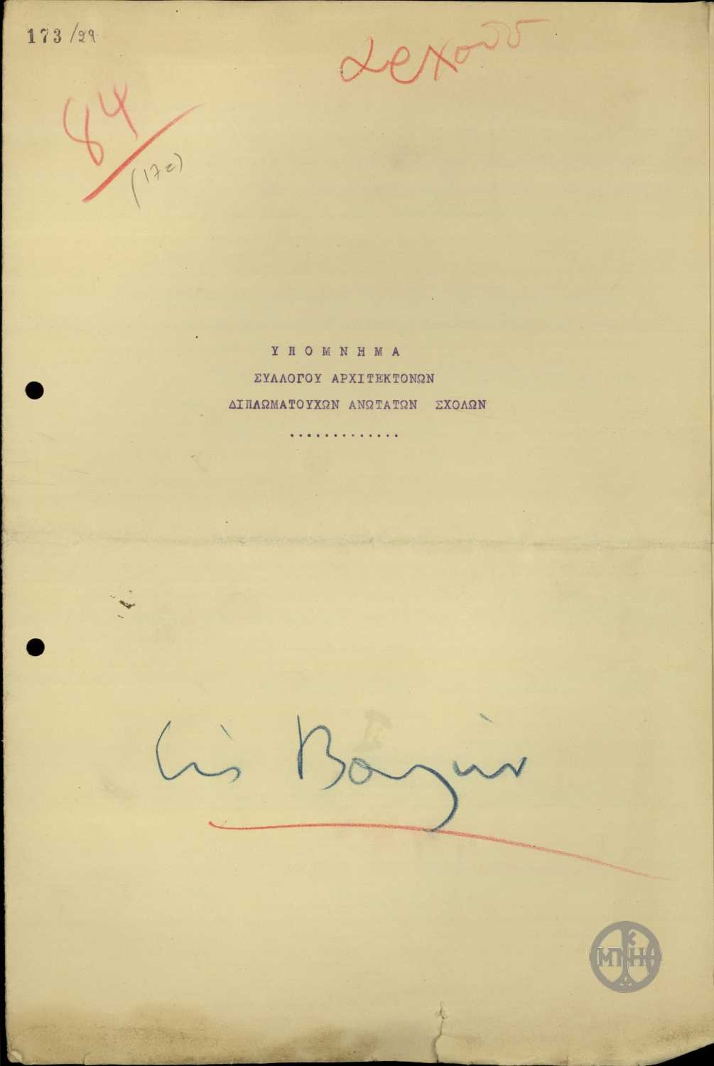 | ΤΙΤΛΟΣ | Υπόμνημα του Συλλόγου Αρχιτεκτόνων Διπλωματούχων Ανωτάτων Σχολών προς τον Πρόεδρο της Κυβέρνησης σχετικά με την εξεύρεση της θέσης για την ανέγερση του Δικαστικού Μεγάρου. |