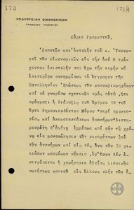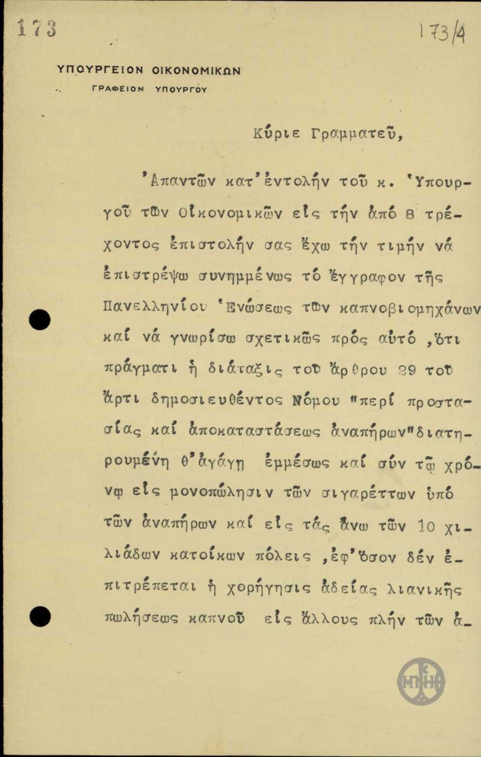 | ΤΙΤΛΟΣ | Επιστολή του Διευθυντή των Εμμέσων φόρων του Υπουργείου Οικονομικών προς τον Ιδιαίτερο Γραμματέα του Πρωθυπουργού, Στ.Στεφάνου, σχετικά με τον Νόμο "περί προστασίας και αποκατάστασης των αναπήρων". |