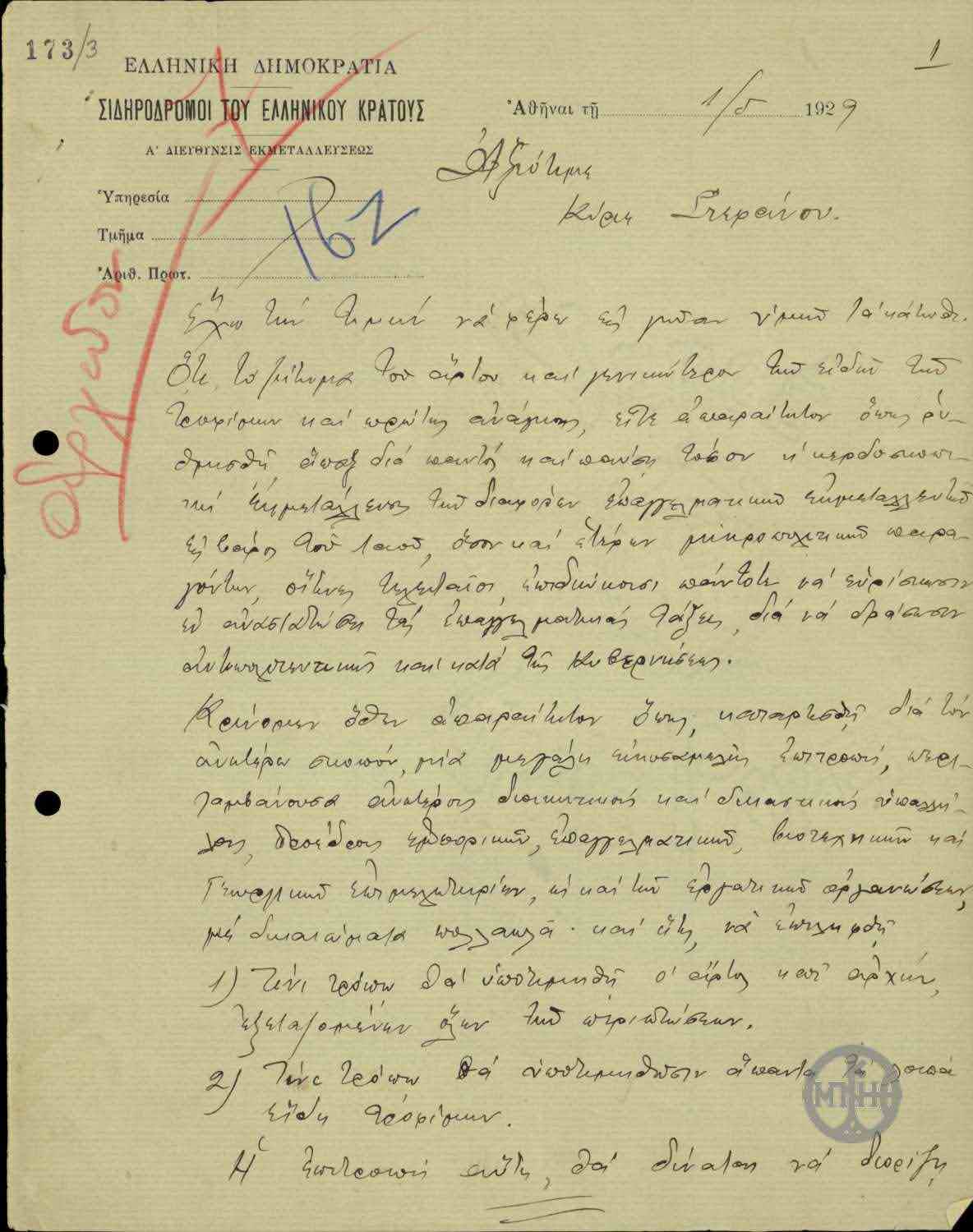 | ΤΙΤΛΟΣ | Επιστολή της Α' Διεθύνσεως Εκμετάλλευσης των Σ.Ε.Κ. προς τον ιδιαίτερο γραμματέα του Ε.Βενιζέλου Στεφάνου σχετικά με την ανάγκη συγκρότησης 20μελούς επιτροπής με αντικείμενο τον έλεγχο των τιμών των προϊόντων και των παρεχόμενων υπηρεσιών της αγοράς |