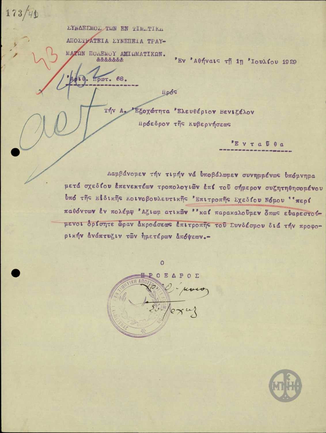 | ΤΙΤΛΟΣ | Διαβιβαστικό του Συνδέσμου των εν τιμητική αποστρατεία συνεπεία τραυμάτων πολέμου αξιωματικών στον πρόεδρο της κυβερνήσεως Ε.Βενιζέλο με το οποίο καταθέτουν υπόμνημα και σχέδιο τροπολογίας σχετικά με το σχεδίο νόμου "περί παθόντων εν πολέμω Αξιωματικών". |