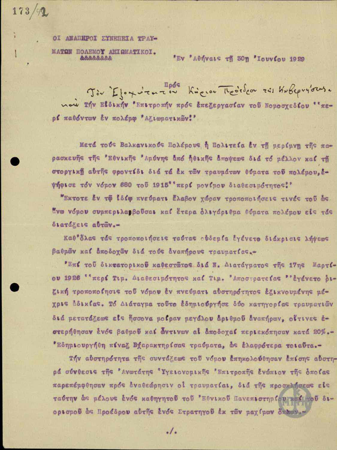 | ΤΙΤΛΟΣ | Υπόμνημα του συνδέσμου των αναπήρων συνεπεία τραυμάτων πολέμου αξιωματικών στον πρωθυπουργό και στην ειδική επιτροπή προς επεξεργασία του νομοσχεδίου "περί παθόντων εν πολέμω αξιωματικών" σχετικά με πρόταση αναθεώρησης του νόμοθετικού διάταγματος "περί τιμητικής διαθεσιμότητας και τιμ.αποστρατείας" που είχε θεσπίστεί επί στρατηγού Παγκάλου το Μάρτιο του 1926. |