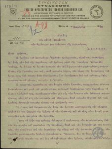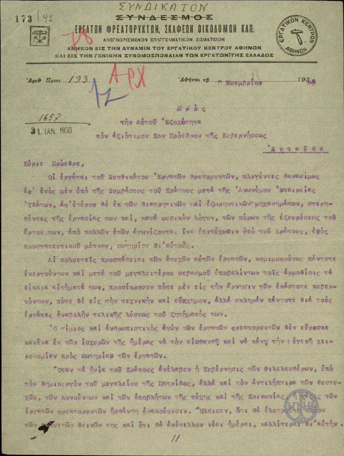 ΤΙΤΛΟΣ | Επιστολή του Συνδικάτου των Εργατών Φρεατορυκτών, Σκαφέων Οικοδόμων προς τον Ε.Βενιζέλο σχετικά με την αδράνεια του κράτους στα αιτήματα των εργατών. |