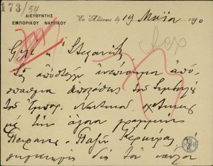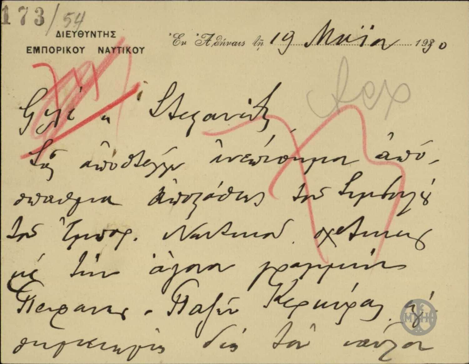 | ΤΙΤΛΟΣ | Διαβιβαστικό του Διευθυντή Εμπορικού Ναυτικού Μπούκα πρός τον Ιδιαίτερο Γραμματέα του Ε.Βενιζέλου, Στ. Στεφάνου ανεπίσημου αποσπάσματος απφάσεως του Συμβουλίου του Εμπορικού Ναυτικού για τις άγονες γραμμές Πειραιώς - Παξών Κέρκυρας. |