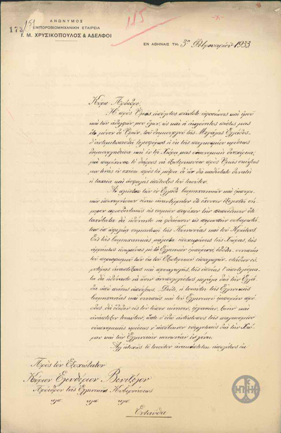 | ΤΙΤΛΟΣ | Επιστολή του Ι. Μ. Χρυσικόπουλου προς τον Ε. Βενιζέλο σχετικά με τους τρόπους ανάπτυξης της βιομηχανίας και γενικότερα της οικονομίας της χώρας. |