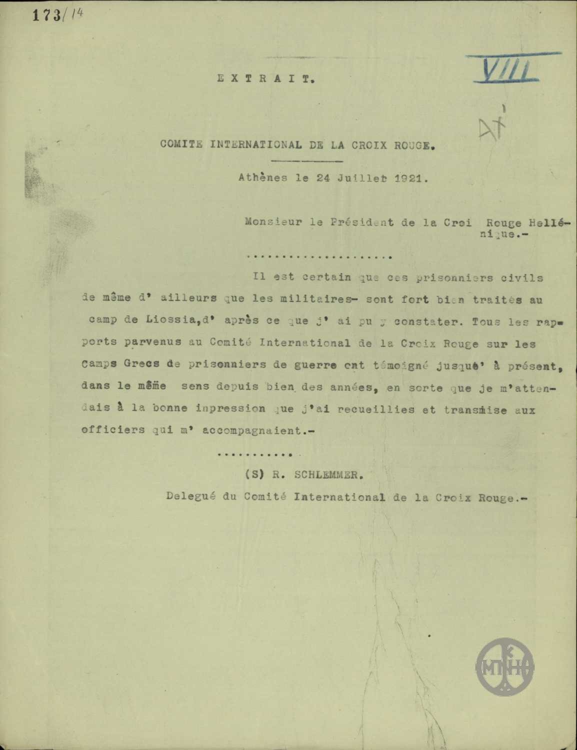 | ΤΙΤΛΟΣ | Τηλεγράφημα του R. Schlemmer αντιπροσώπου της Διεθνούς Επιτροπής του Ερυθρού Σταυρού προς τον Πρόεδρο του Ελληνικού Ερυθρού Σταυρού σχετικά με τις συνθήκες κράτησης των πολιτικών και στρατιωτικών κρατουμένων. |