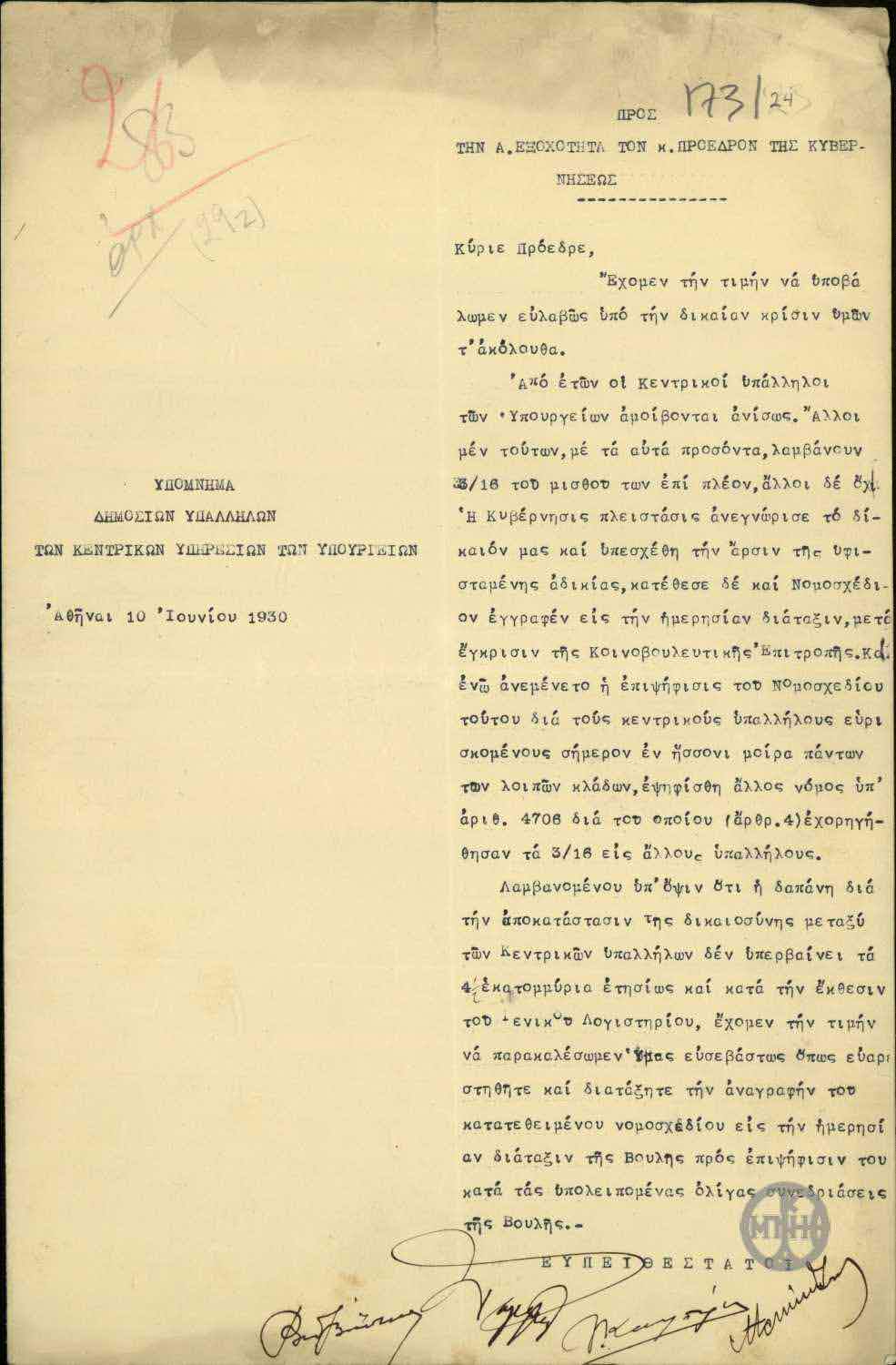 | ΤΙΤΛΟΣ | Υπόμνημα των Δημοσίων Υπαλλήλων των Κεντρικών Υπηρεσιών των Υπουργείων προς τον Ε. Βενιζέλο σχετικά με τις άνισες αμοιβές των υπαλλήλων. |