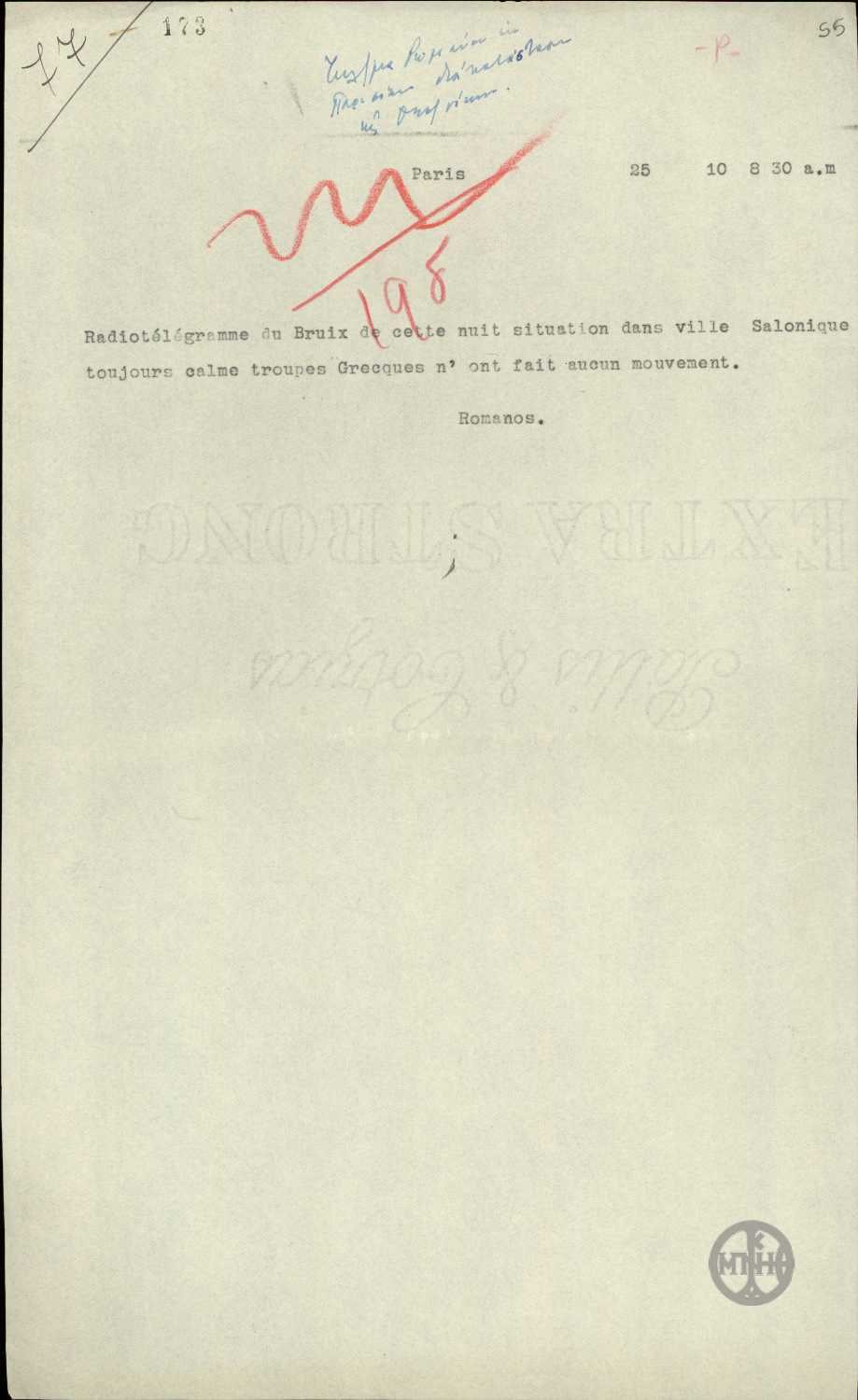 | ΤΙΤΛΟΣ | Τηλεγράφημα του Α.Ρωμάνου σχετικά με την κατάσταση στη Θεσσαλονίκη. |